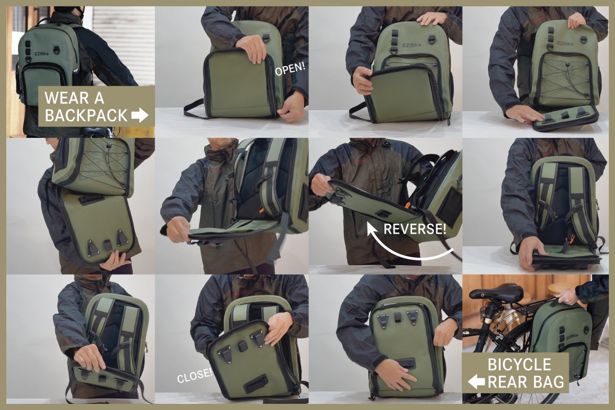 特殊リバーシブル構造により、「自転車リアバッグ」⇆「リュック」に瞬間チェンジ。アウトドアのシーンごとにバッグを変える必要がなくなります。サイクリング、釣り、キャンプ、このバッグ1つあればもう十分です。
