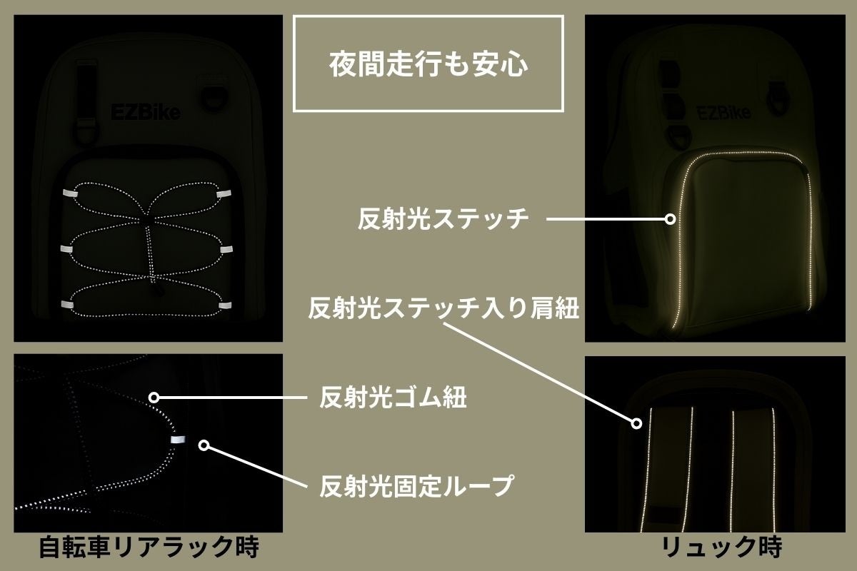 各部位に反射素材を用いているため、夜間でも反射光で安全走行をサポートします。