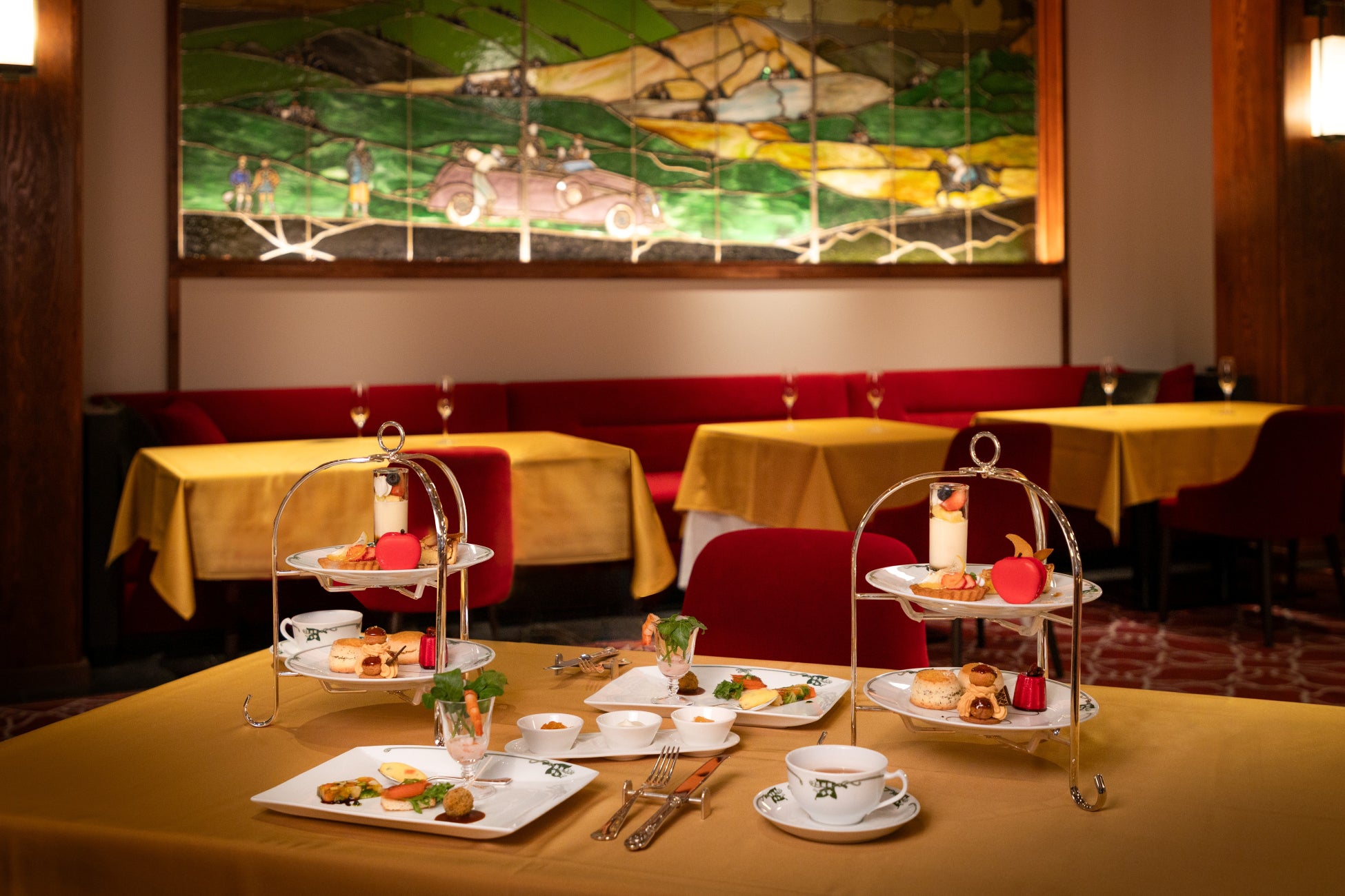 2024年のリニューアル後、初めてのアフタヌーンティーが登場。窓外に広がる凛とした冬景色を眺めながら、ホテルの歴史を映すスイーツとセイボリーの数々をお楽しみいただけます。スイーツには、カフェテラスで人気のクラシックプリンにフルーツを添えたパフェ仕立てや、ロイヤルミルクティーのサントノーレ、信州産紅玉りんごのフィリングを挟んだマカロンなどをご用意。さらに、20年前の人気メニューであった松の実タルトも復刻し、懐かしさと新しさを感じていただける逸品に仕上げました。セイボリーには、信州サーモンのオープンサンドや、ホテルの象徴であるステンドグラスをイメージした野菜のプレッセに加え、伝統のデミグラスを使ったコロッケなどをご用意。万平ホテルの魅力と、多彩な地元食材を取り入れたメニューで、軽井沢ならではの恵みを感じていただけます。
