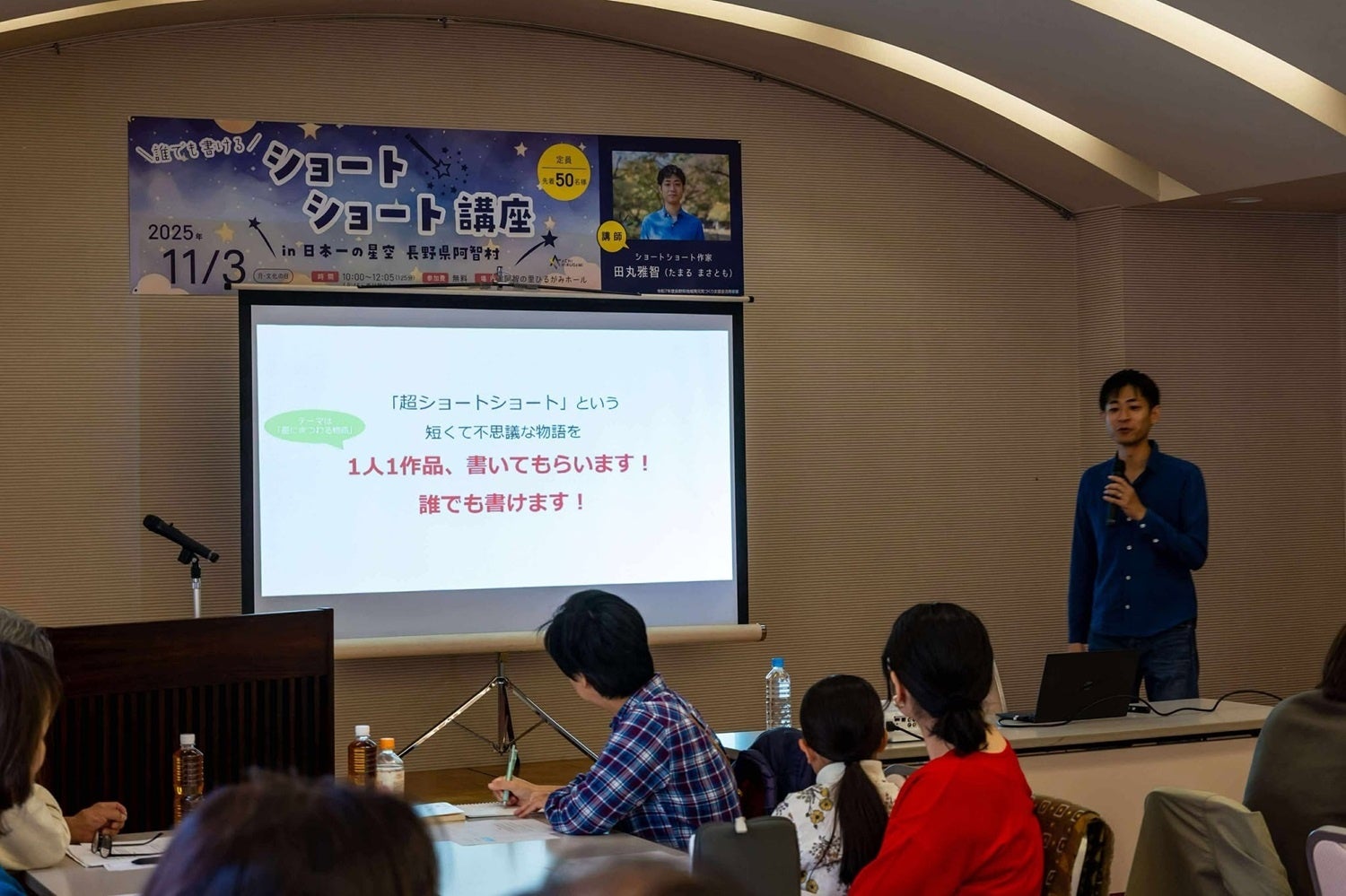 このたび、現代ショートショートの旗手として幅広く活動している田丸雅智さんを講師に迎え、2025年11月3日(月・文化の日)に阿智村にて「誰でも書けるショートショート講座」を開催いたしました。