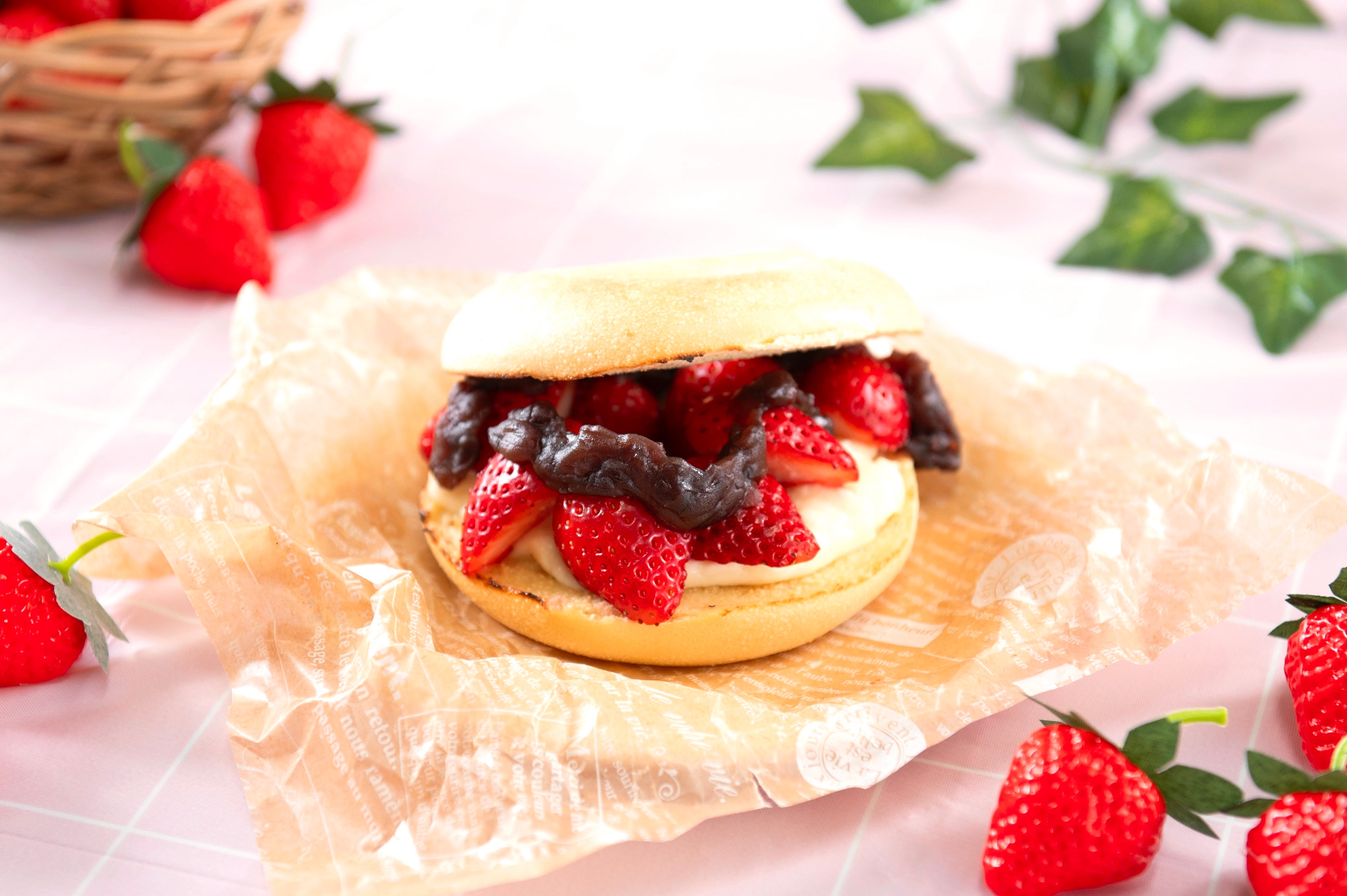 まろやかな甘さの佐野市産「とちあいか」と、粒あん・豆乳クリームを合わせた春のベーグルスイーツサンドです。