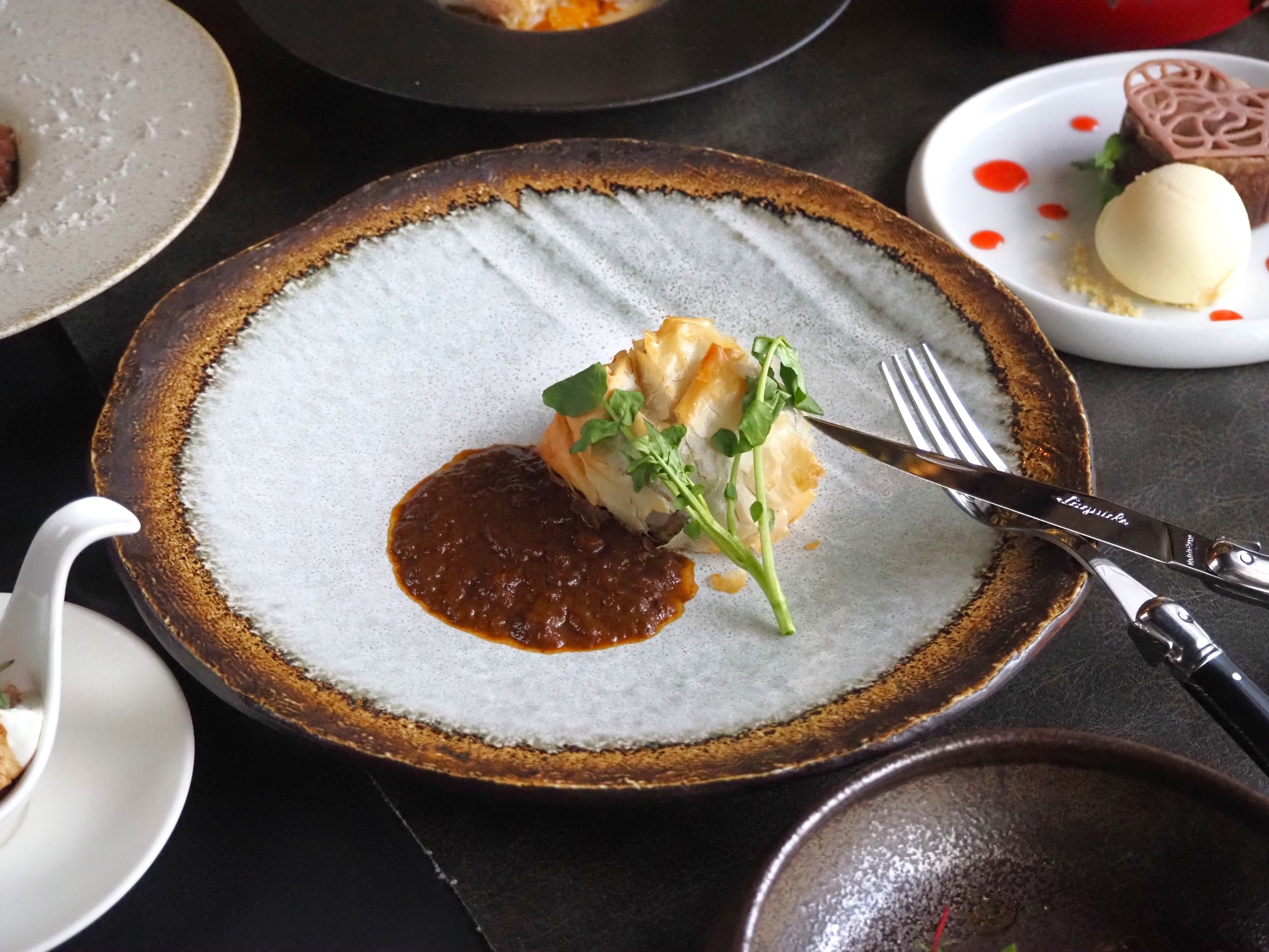 厚みのあるお肉を、お肉の乾燥を防ぐための少量のソースと共に、複数の層にしたパートフィロ(パイ生地)で包みました。パートフィロとソースを分けることで、サクサクの食感を維持。