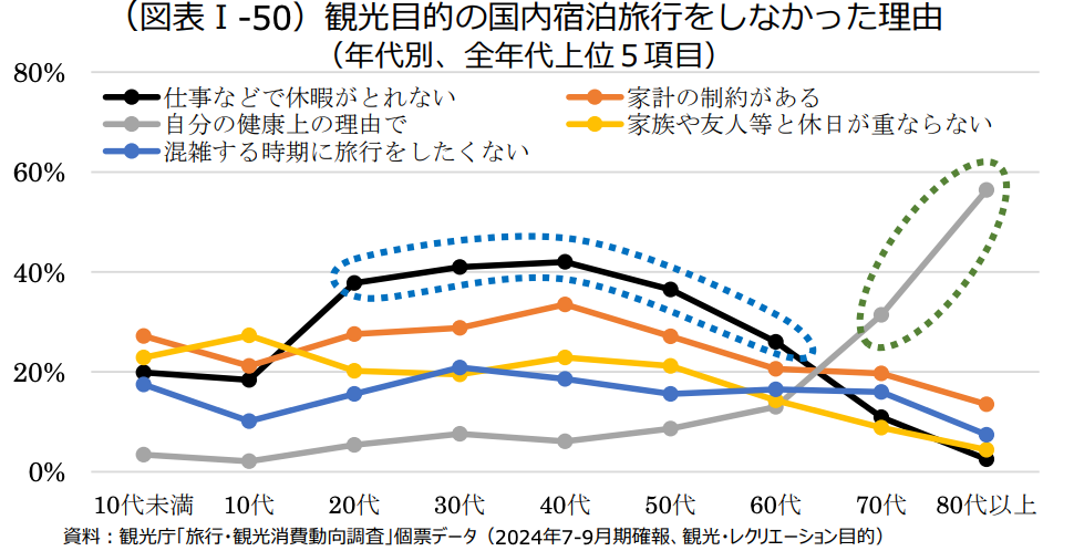 国内旅行は幅広い年代にとって身近な余暇である一方、高齢化の進展とともに「行きたいのに行けない」ギャップが拡大しています。観光庁『令和7年版 観光白書(概要)』によれば、観光目的の国内宿泊旅行をしなかった理由は、20〜60代では「休暇がとれない」「家計の制約」等が中心であるのに対し、70代は「自分の健康上の理由で」が31.3%80代以上では53.0%と、健康要因が突出します。(出典①)