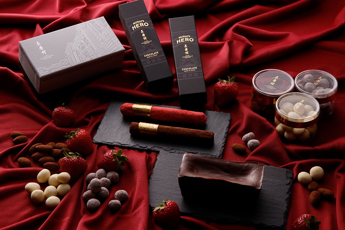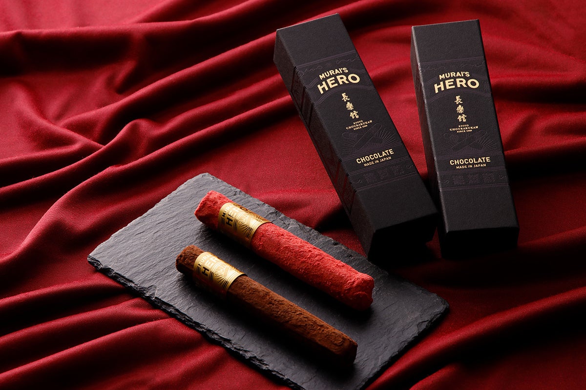 長楽館の創設者・村井吉兵衛が手掛けたたばこ「HERO(ヒーロー)」をモチーフにした、長楽館のシグネチャーチョコレート「MURAI’s HERO」。バレンタインシーズンは定番のMURAI’s HEROと、期間限定の苺のHEROを1本ずつ詰め合わせた2本セットにてご用意いたします。