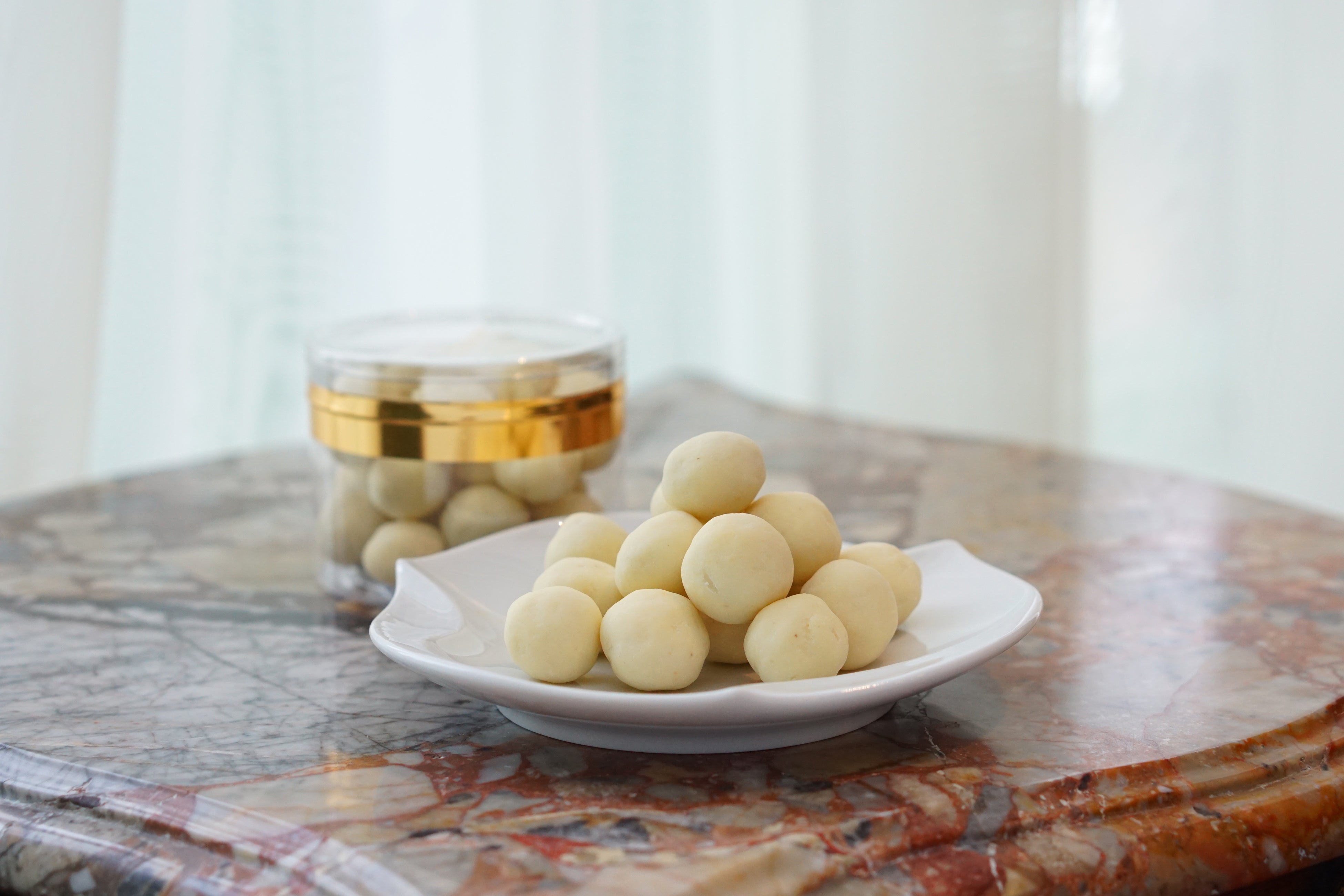 【マカダミア】 低温でじっくりローストしたマカダミアナッツを、塩味を効かせたホワイトチョコレートで包み込んだクセになる味わい。