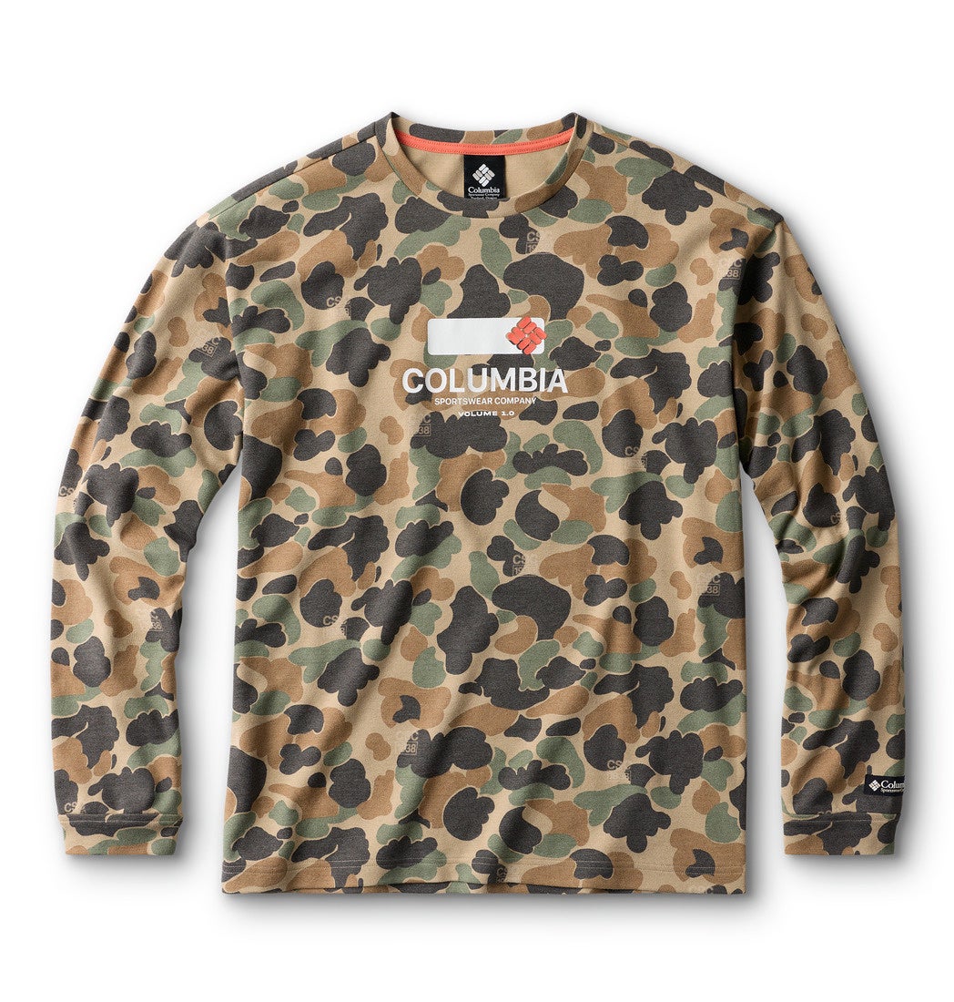 クラシックなコロンビアのハンティングギアから着想を得つつ、どんなシーンでも着用できる汎用性と存在感のあるスタイルにアップデートしたロングスリーブTシャツ。アーカイブのハンティングギアにインスパイアされたBritish Tan Duck Camoを全面にプリントしました。