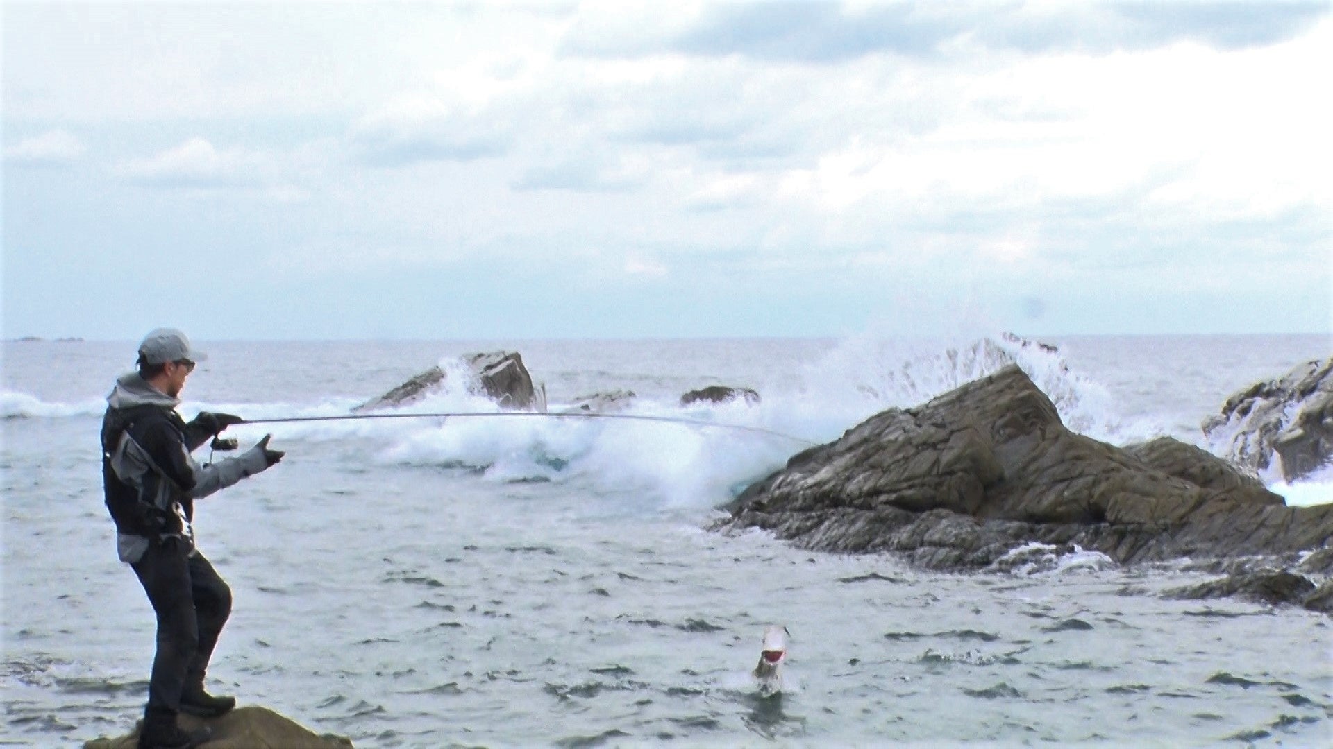 ヒラスズキが釣れやすいとされる磯際に出来る白波‟サラシ”も出ており、松永も期待を寄せる。