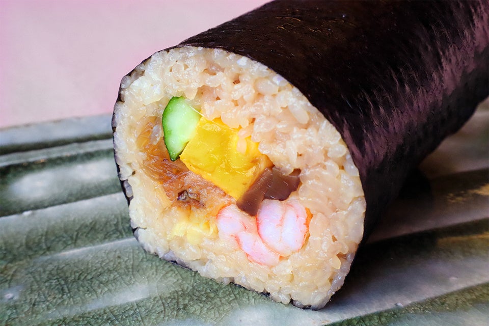 海老、海老おぼろ、胡瓜、干瓢、椎茸、玉子焼き