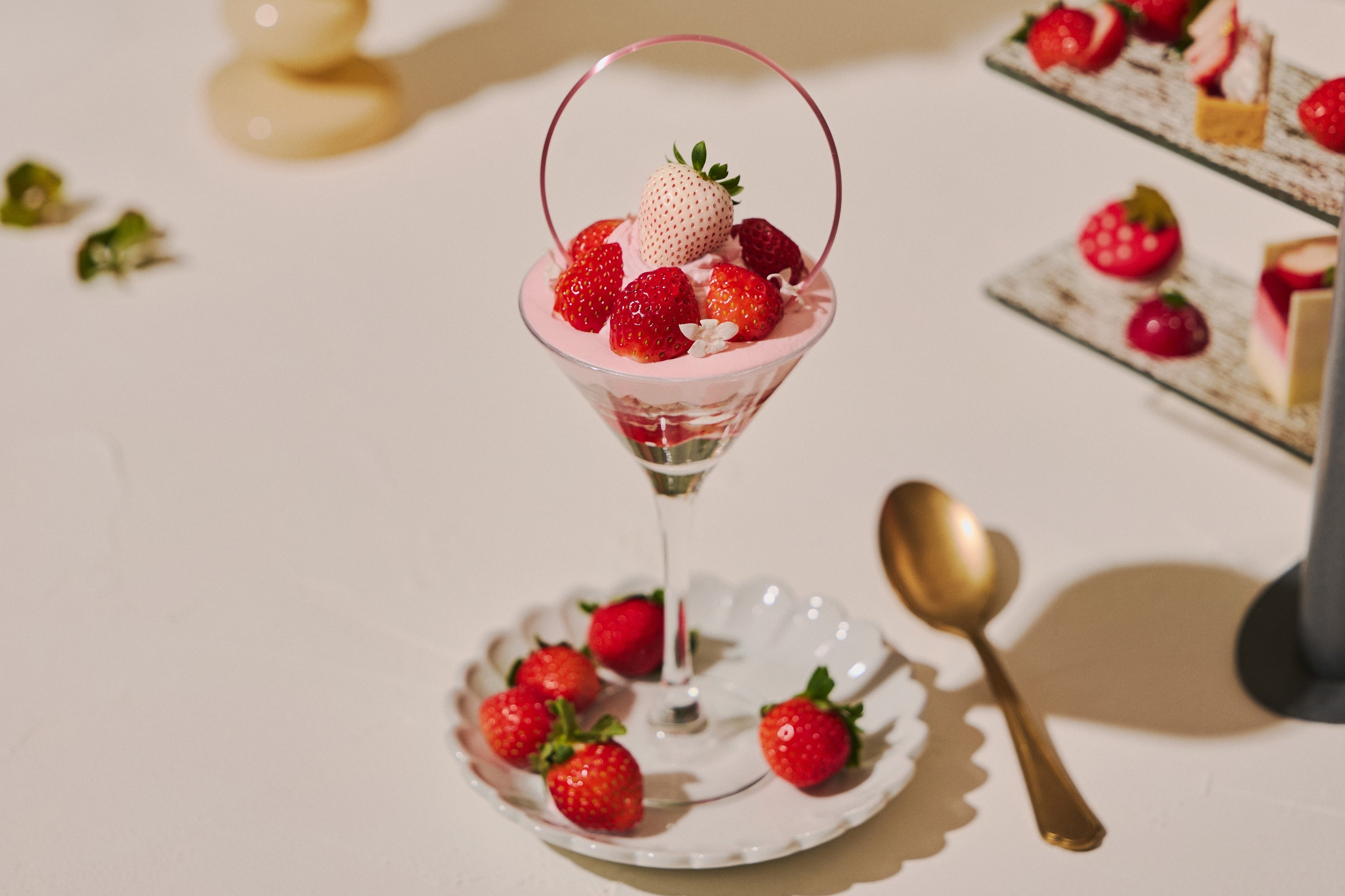 今回のテーマは、フレッシュのいちごがきらめくウェルカムデセールのパルフェを主役に、冬から春への美しい季節のうつろいを鮮やかに表現したアフタヌーンティー。春の訪れとともに、2月24日(火)からは“白いちご”と繊細な飴細工を美しく飾った、さくら香るウェルカムデセール「パルフェ・プランタニエ」と、グレープフルーツの爽やかな酸味といちごの甘さがほのかなさくら風味と調和し、春風を思わせるウェルカムドリンク「スプリング・ブリーズ」をご用意。いちごの魅力を春らしく表現し、装いを新たにお届けします。
