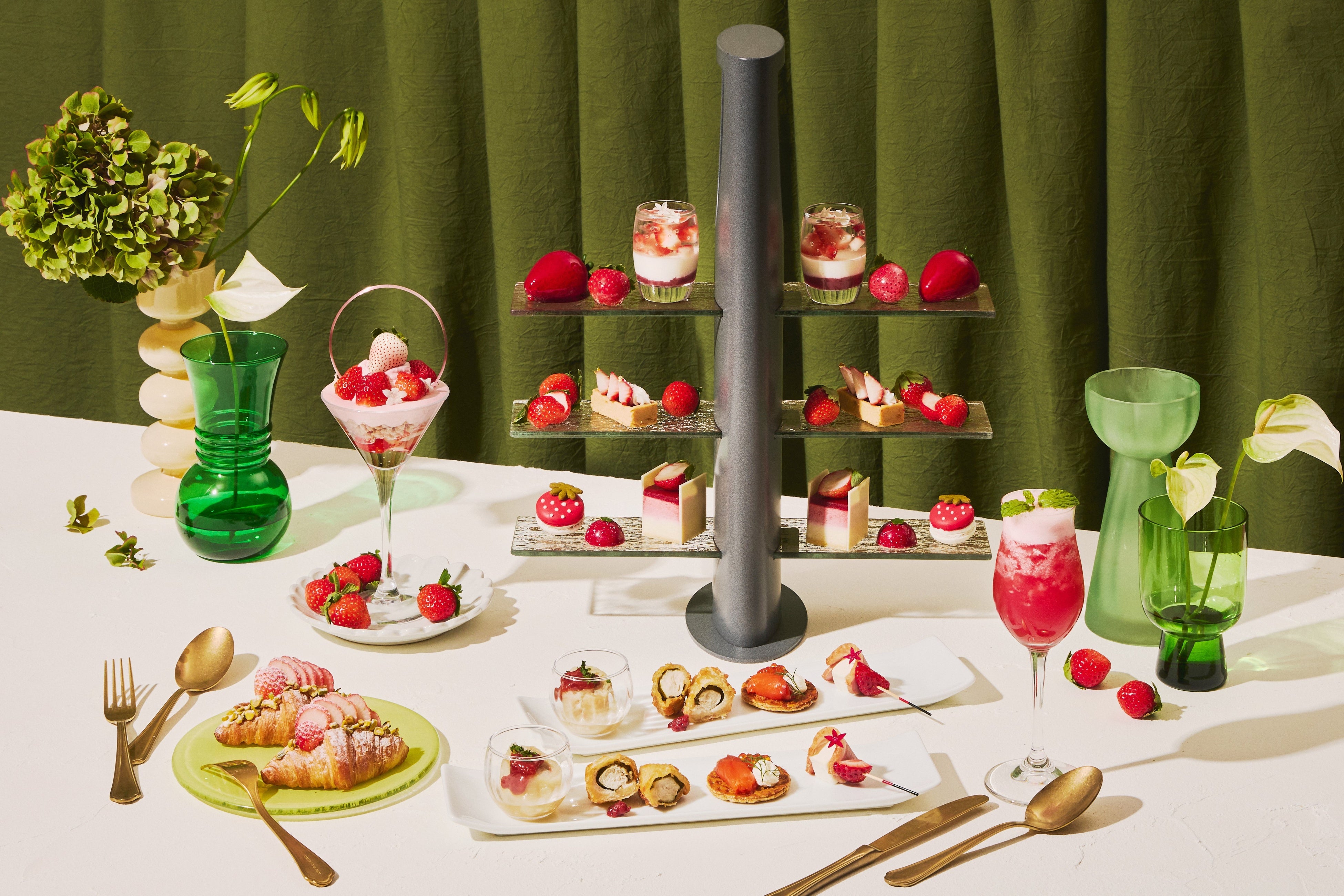 いちごづくしの7種類のスイーツや4種類のセイボリー、華やかな「クロワッサンサンド」とともにお楽しみください。また、京都・和束町産の茶葉を使用する和紅茶をはじめとしたフレーバーティーやカフェラテ、ホットチョコレートなど約30種類のドリンクは、フリーフローでご提供いたします。