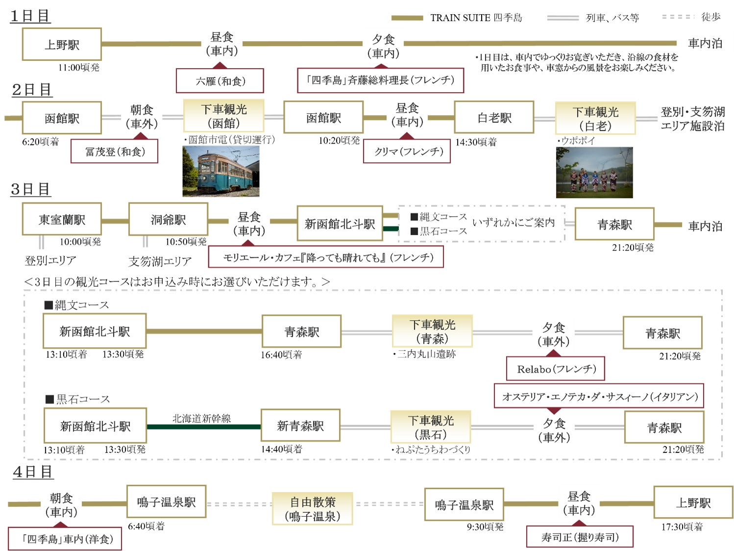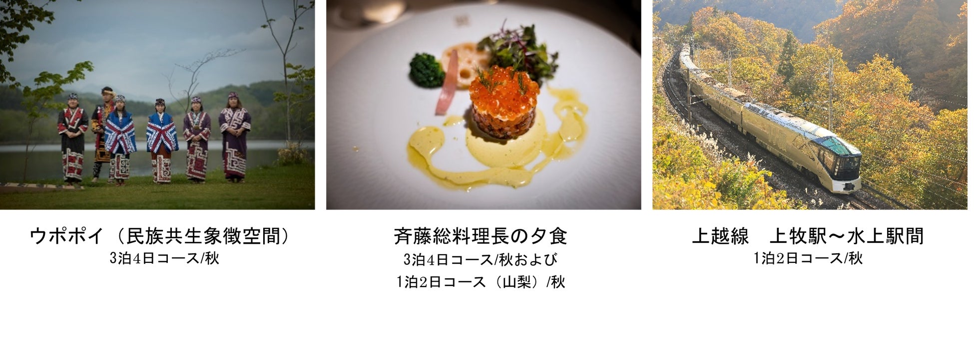「3泊4日コース/秋」は、「大自然の織りなす風景と、受け継がれてきた悠久の文化にふれる旅。」をテーマに、上野駅を出発し、北海道の函館・道南、そして本州に戻り、東北の文化に触れます。
