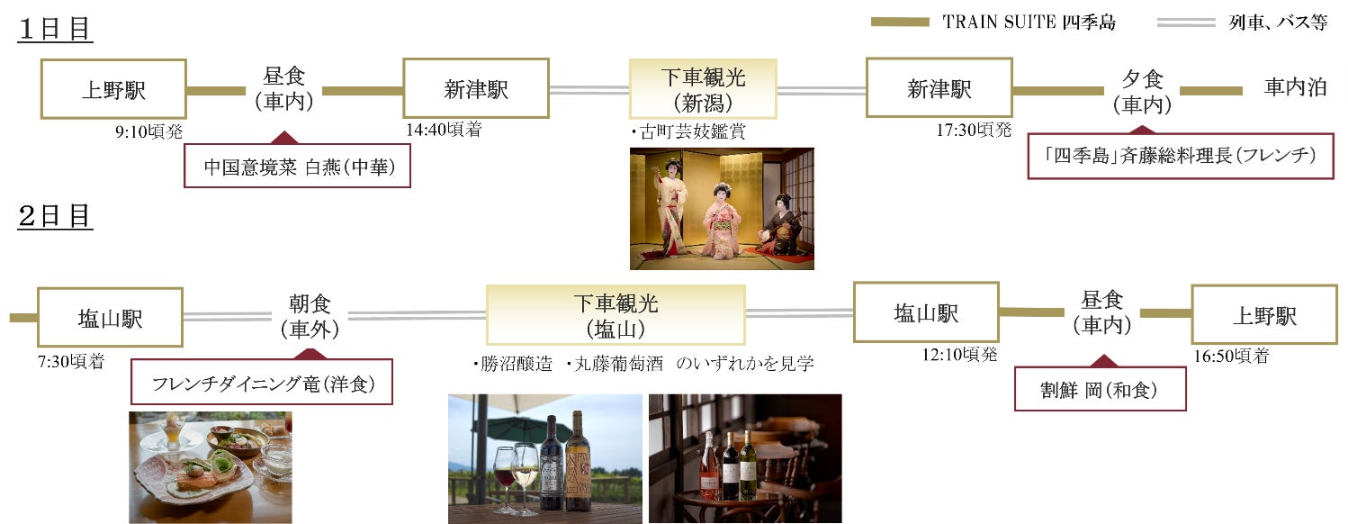 「1泊2日コース(山梨)/秋」は、「みなとまちが育んだ豪商の粋と、豊かな里山の恵みを味わう旅。」をテーマに、上野駅を出発し、新潟県と山梨県を巡ります。