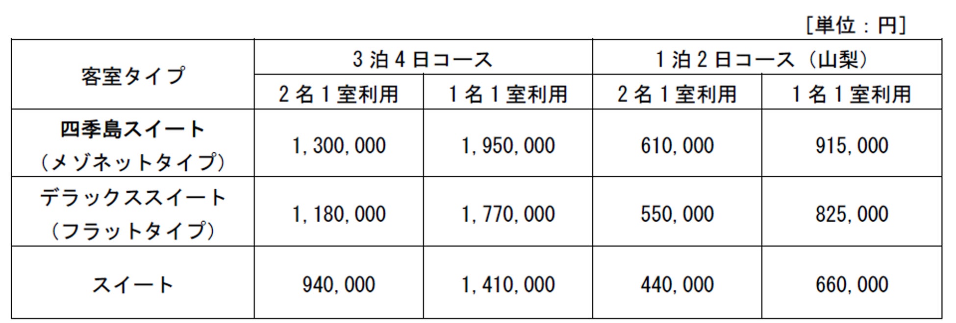 多くのお客さまからご好評をいただいている、「3泊4日コース/秋」、「1泊2日コース(山梨)/秋」の2つのコースを継続して設定します。