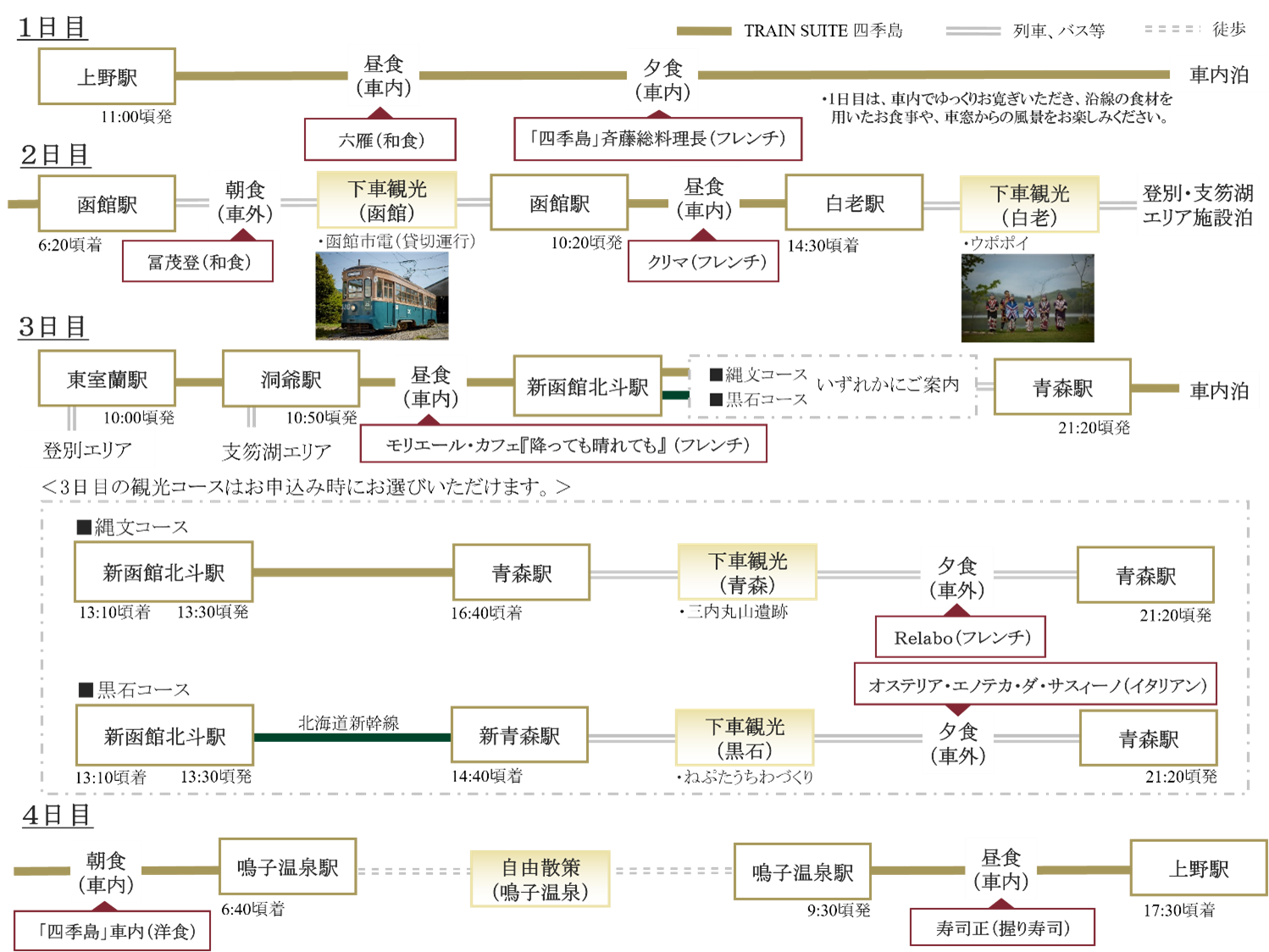「3泊4日コース/秋」は、「大自然の織りなす風景と、受け継がれてきた悠久の文化にふれる旅。」をテーマに、上野駅を出発し、北海道の函館・道南、そして本州に戻り、東北の文化に触れます。