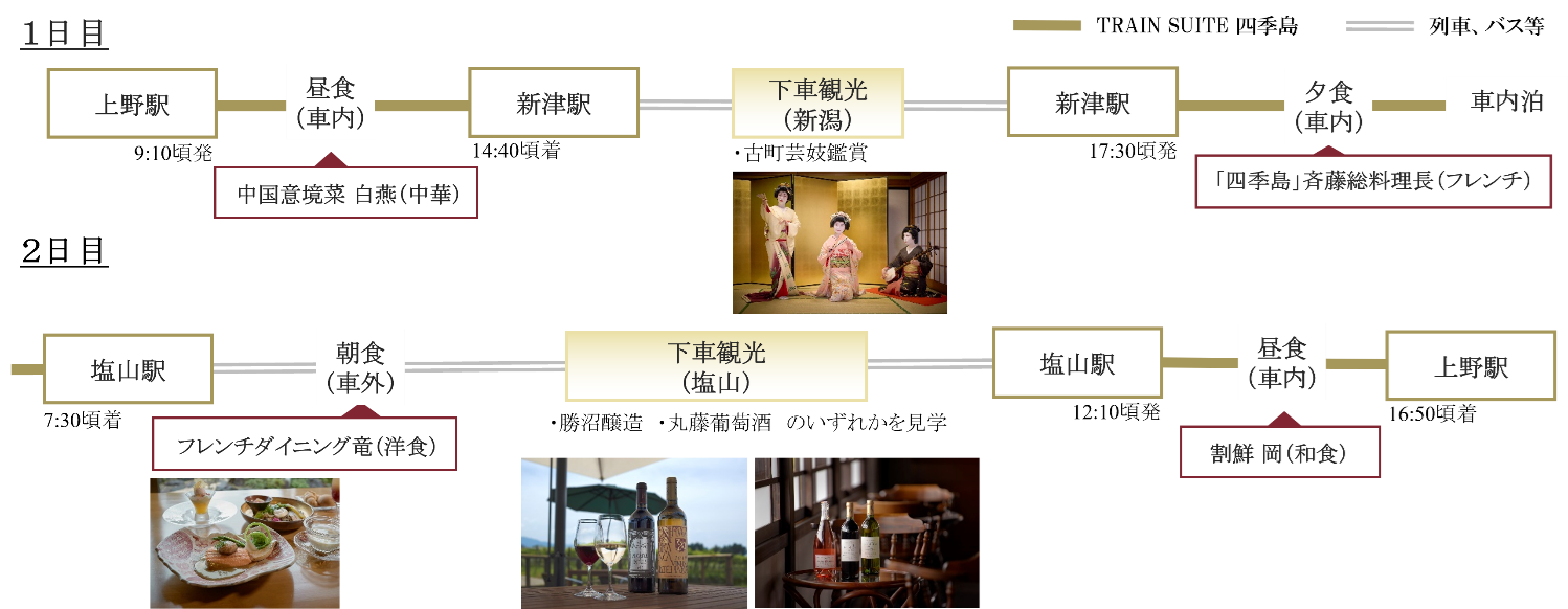 「1泊2日コース(山梨)/秋」は、「みなとまちが育んだ豪商の粋と、豊かな里山の恵みを味わう旅。」をテーマに、上野駅を出発し、新潟県と山梨県を巡ります。