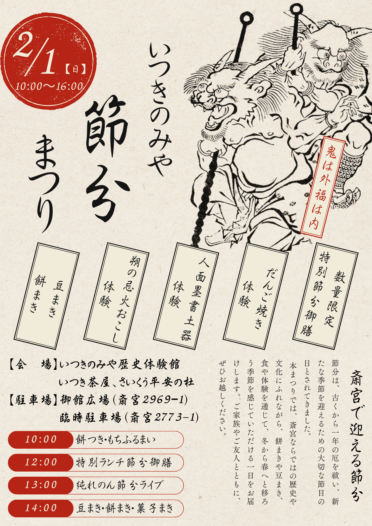 「いつきのみや節分まつり」では、節分にちなんだ豆まきをはじめ、斎宮の文化にふれられる体験プログラムを展開します。