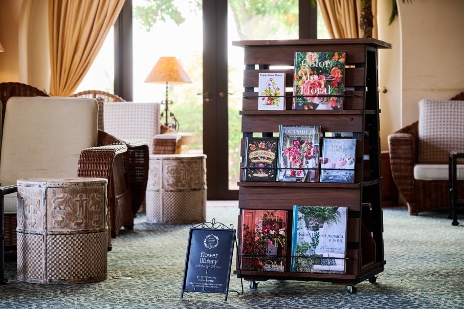 花や植物にまつわる書籍が並ぶフラワーライブラリーがラウンジ「アリアカラ」にオープン。お気に入りの本とともにゆったりとしたティータイムをお過ごしください。