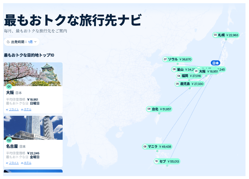 最もおトクな旅行先ナビは予算を抑えながら旅行先の選択肢を広げる、スピーディーで賢い検索ツールです。 ユーザーが指定した月ごとに、平均価格が安い旅行先をランキング形式で提示します。感覚ではなく数字で比較できるため、費用を懸念する多くの旅行者にとって強力なサポートツールとなります。