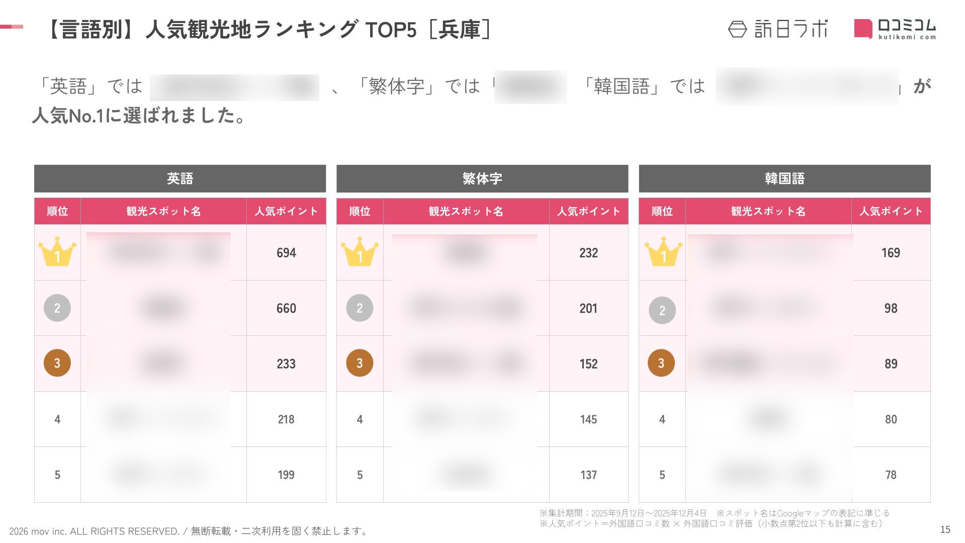業界最大級のインバウンドビジネスメディア「訪日ラボ」及び 店舗向け集客一元化プラットフォーム「口コミコム」を運営する株式会社mov(代表取締役:渡邊 誠、本社:東京都渋谷区、以下mov)は、兵庫県の観光地に寄せられた最新の口コミデータから、独自の『インバウンド人気観光地ランキング』を発表しました。