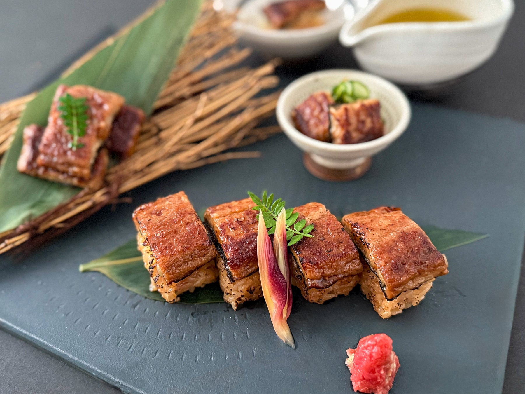 修業時代に学んだ精進料理から着想を得て、「精進うなぎ」を考案しました。九州のもめん豆腐や山芋、牛蒡、海苔を用いて鰻の食感を再現。蒲焼、寿司、酢の物、お茶漬けの四種で構成し、和食ならではの技法と味わいを楽しめる一皿です。