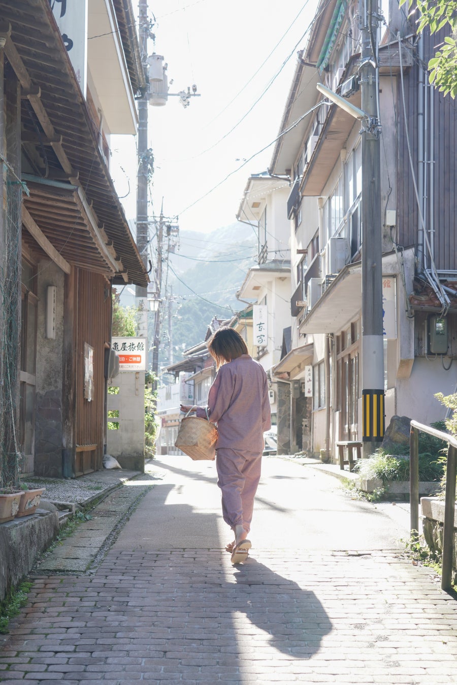―作務衣に着替え、湯かごを手に、下駄を履いて温泉街を歩く。