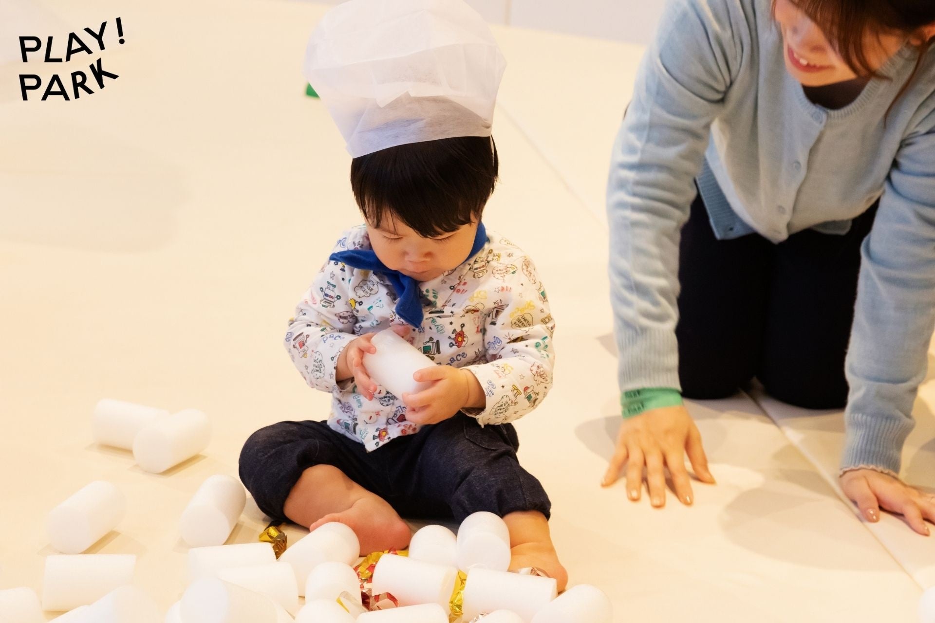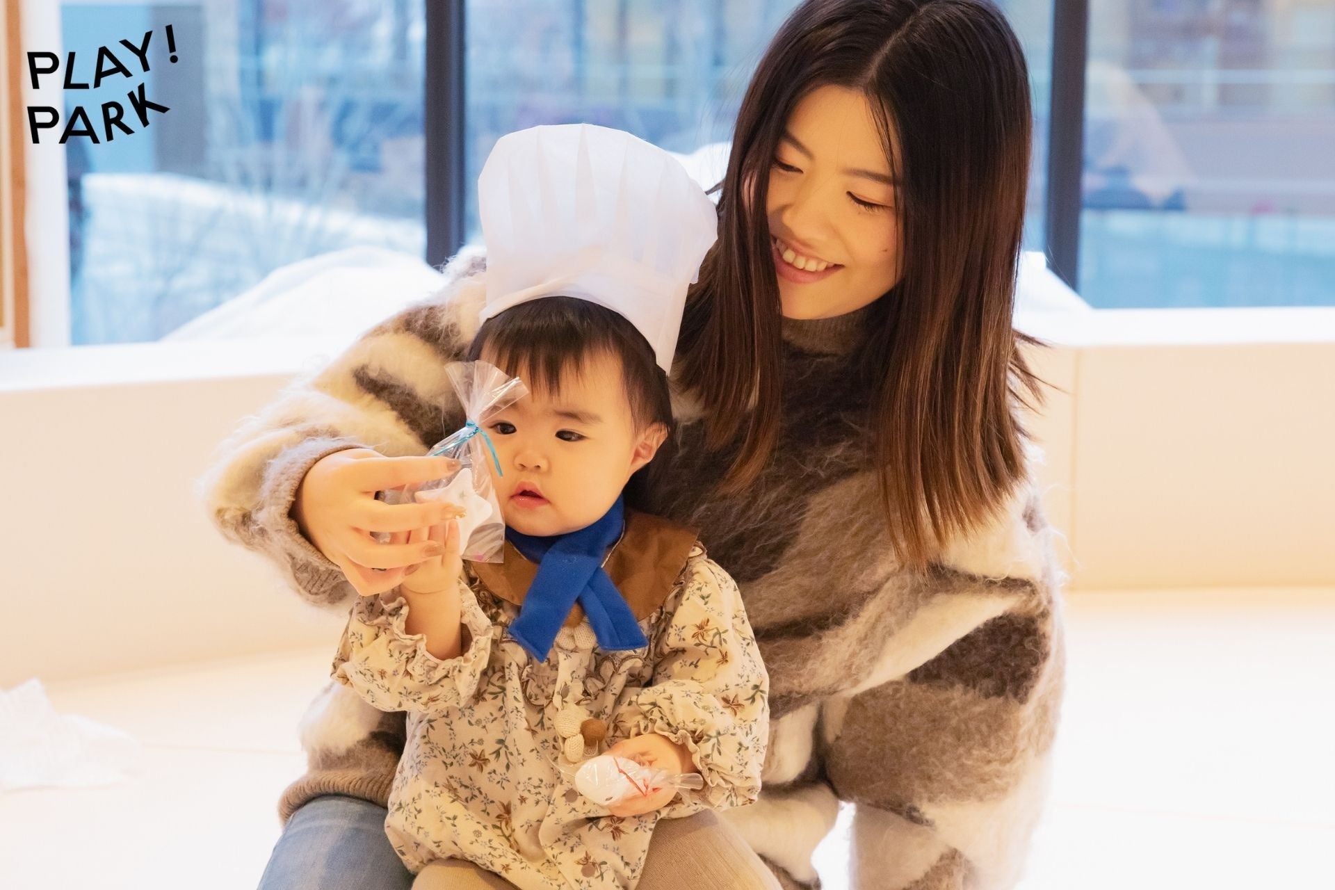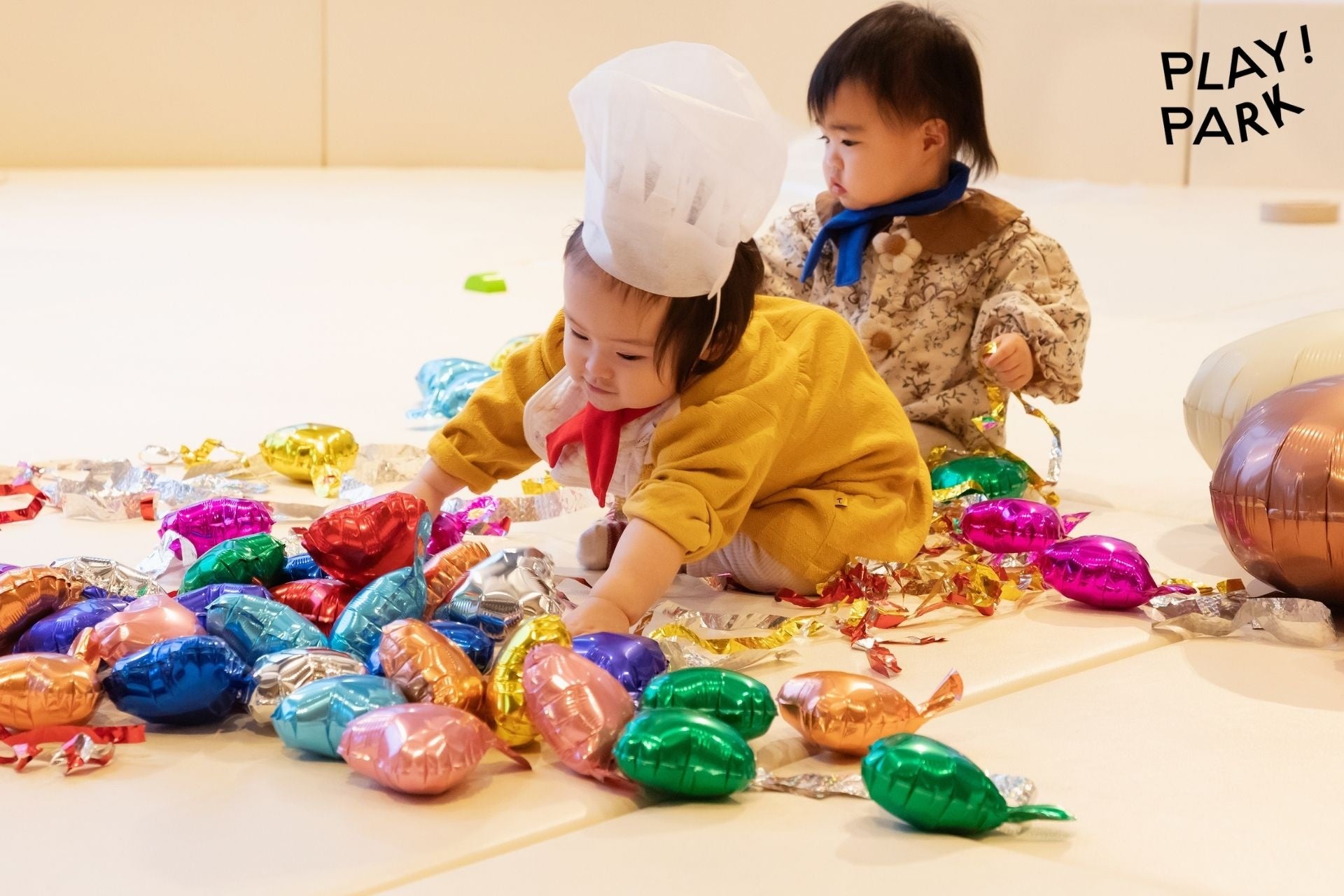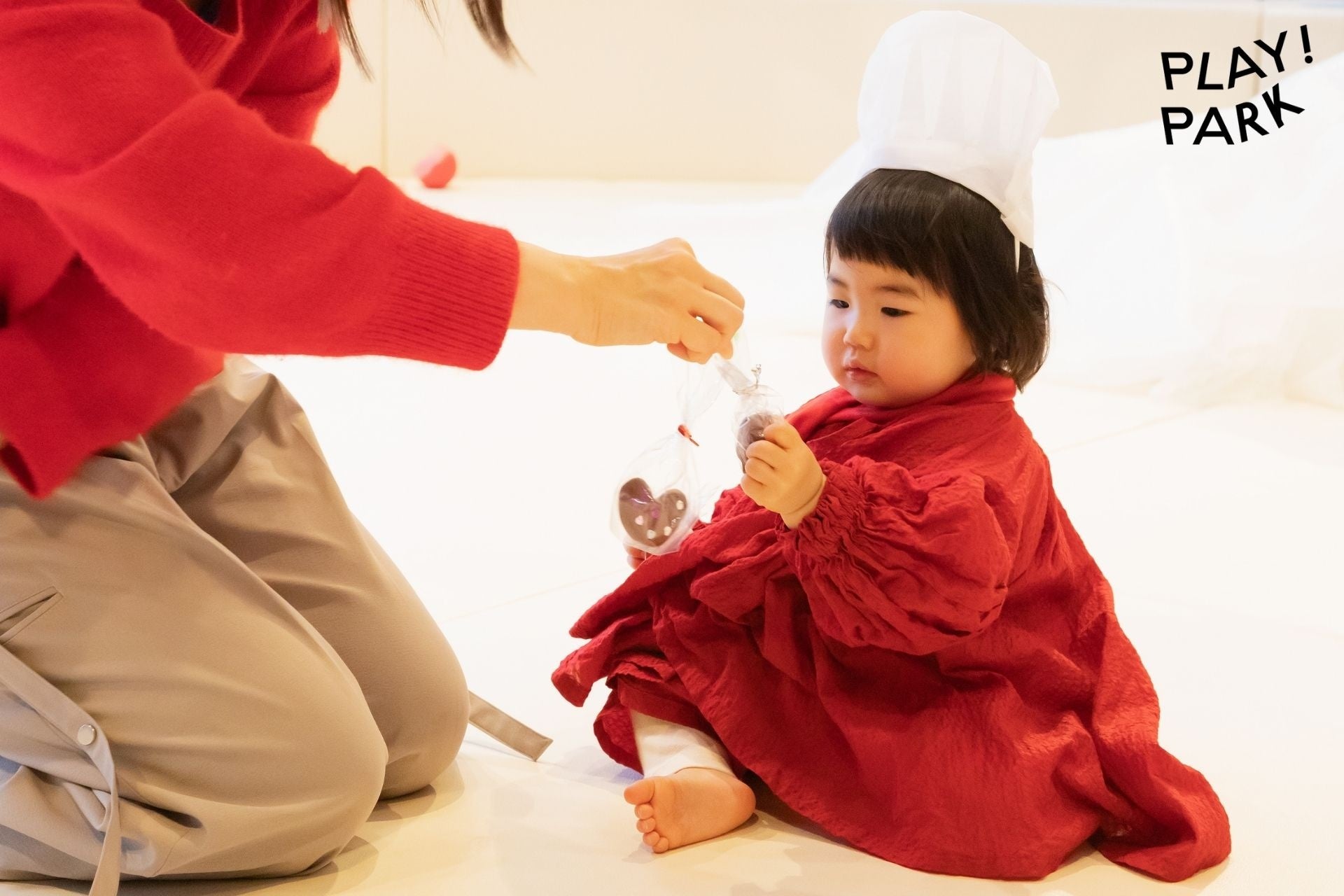 PLAY! PARKでは、月齢の小さな赤ちゃんでも安心して楽しめる季節イベントを定期的に実施しています。今回は初めて、バレンタインとホワイトデーにフォーカスし、赤ちゃんがパティシエに変身して楽しむ「粘土クッキング」と、見て・触って楽しめる触感遊びの「カラフルなパーティー」を用意しました。親子で一緒に、色鮮やかで美味しそうな世界観を体験できます。