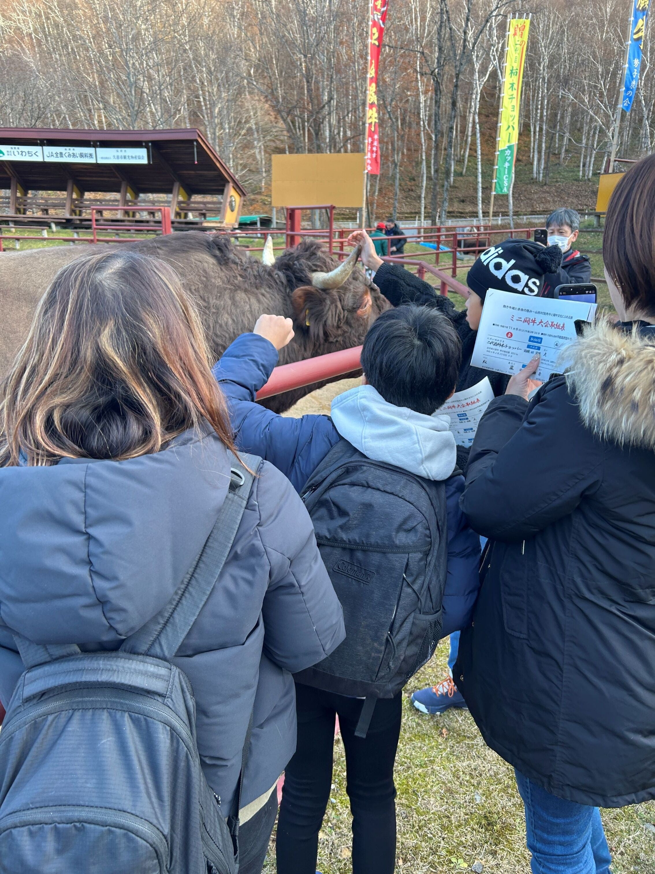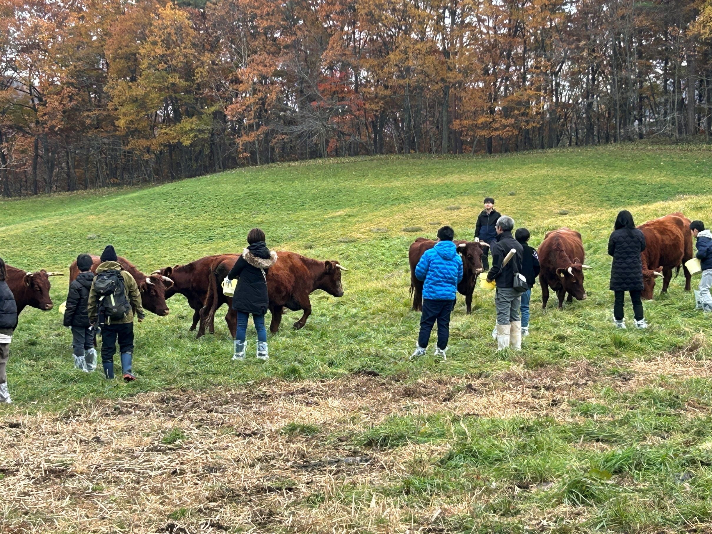 自然放牧で伸び伸びと暮らす山形村短角牛。近くで餌をやり、触れる機会です。