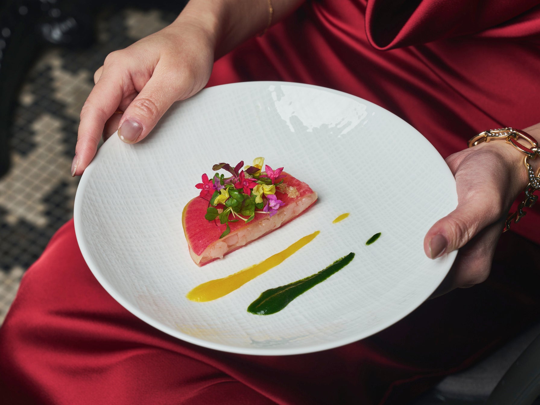 ブラッスリー「RÉGINE」では、素材の本質と向き合うことから生まれる美しさを一皿に昇華した、特別メニューをご用意いたします。「甘エビのタルタル 蕪のラヴィオリ仕立て」は、とろけるような甘みを湛える甘エビを、あえて塩のみで引き締め、その純粋な旨味を際立たせた一品。余計な装飾を排し、素材そのものの力を引き出すことにフォーカスしています。甘エビの上に重ねるのは、薄く整えた蕪のヴェール。口に運んだ瞬間、甘エビの濃密な旨味と蕪のみずみずしさが同時にほどけ、静かな余韻を残します。変わることのない価値を見つめ続けるブラッスリー「RÉGINE」の美学を体現した、タイムレスな一皿をお楽しみください。