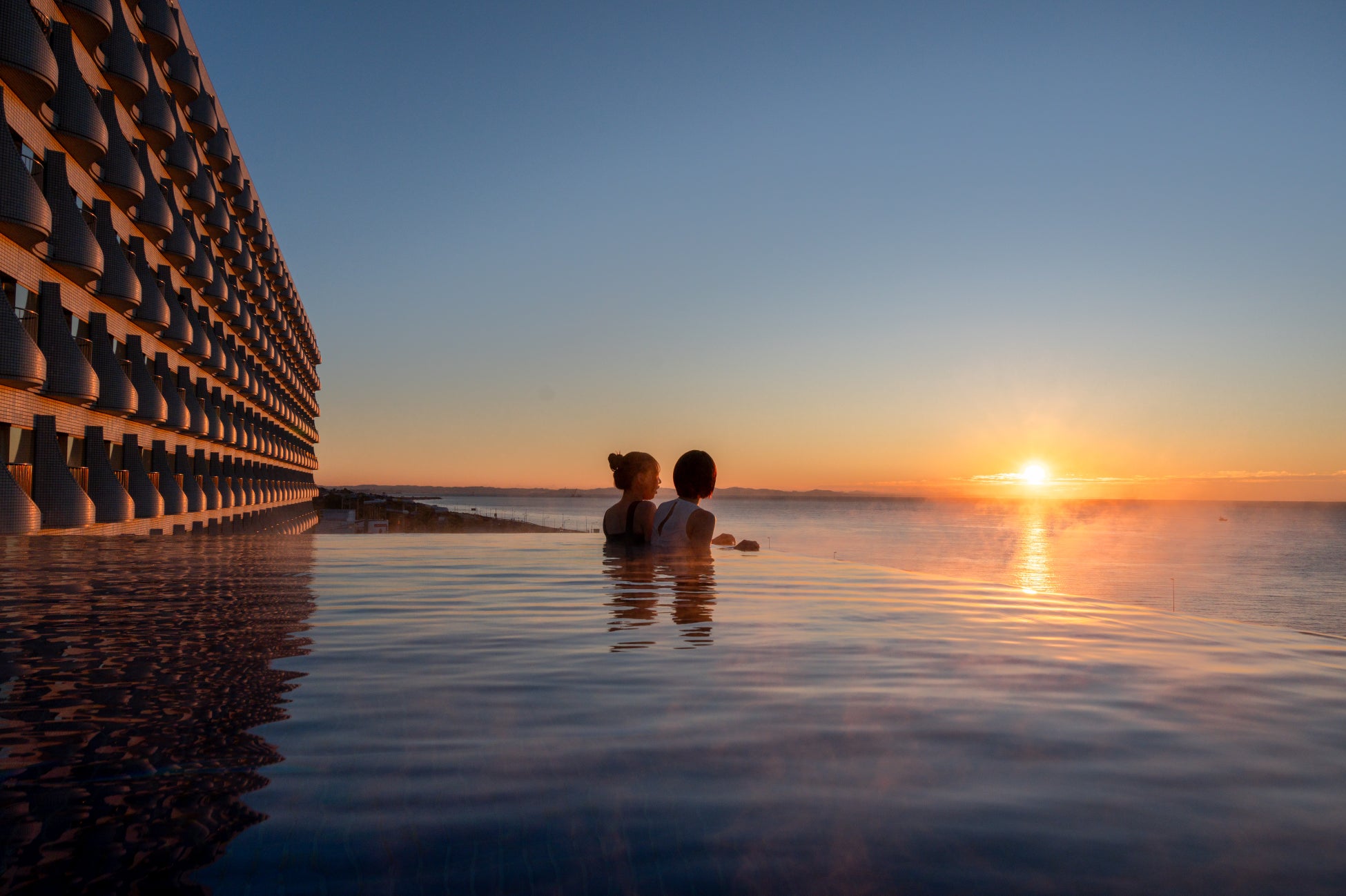 冷たい空気とあたたかな水温の差によって自然に湯けむりが立ちのぼり、相模湾の水平線・富士山のシルエット・朝焼け・ブルーアワーなど、“冬の凛とした空気だからこそ美しく映える景色”が広がります。