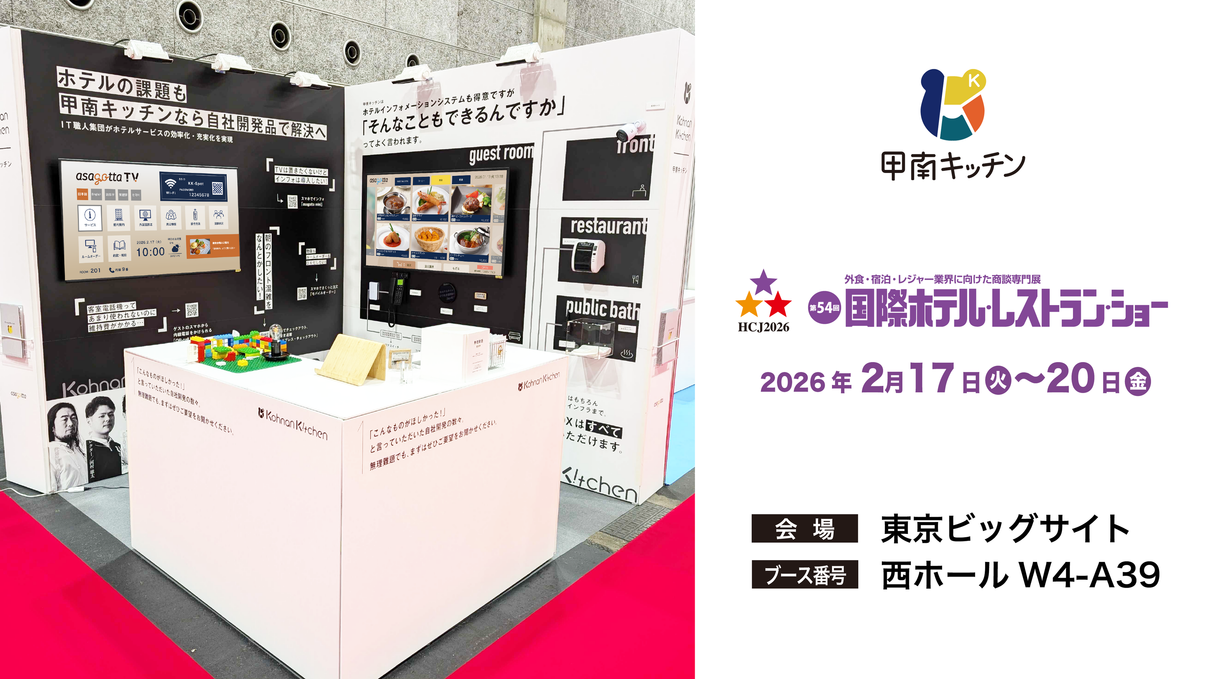 ホテル向けITソリューション「asagotta」シリーズを開発する合同会社甲南キッチン(兵庫県神戸市、代表社員:砂田祥平)は、2026年2月17日(火)から20日(金)の4日間にわたり、東京ビッグサイトで開催される「第54回国際ホテル・レストラン・ショー(HCJ 2026)」に出展いたします。甲南キッチンのブース番号は【西4ホール W4-A39】です。
