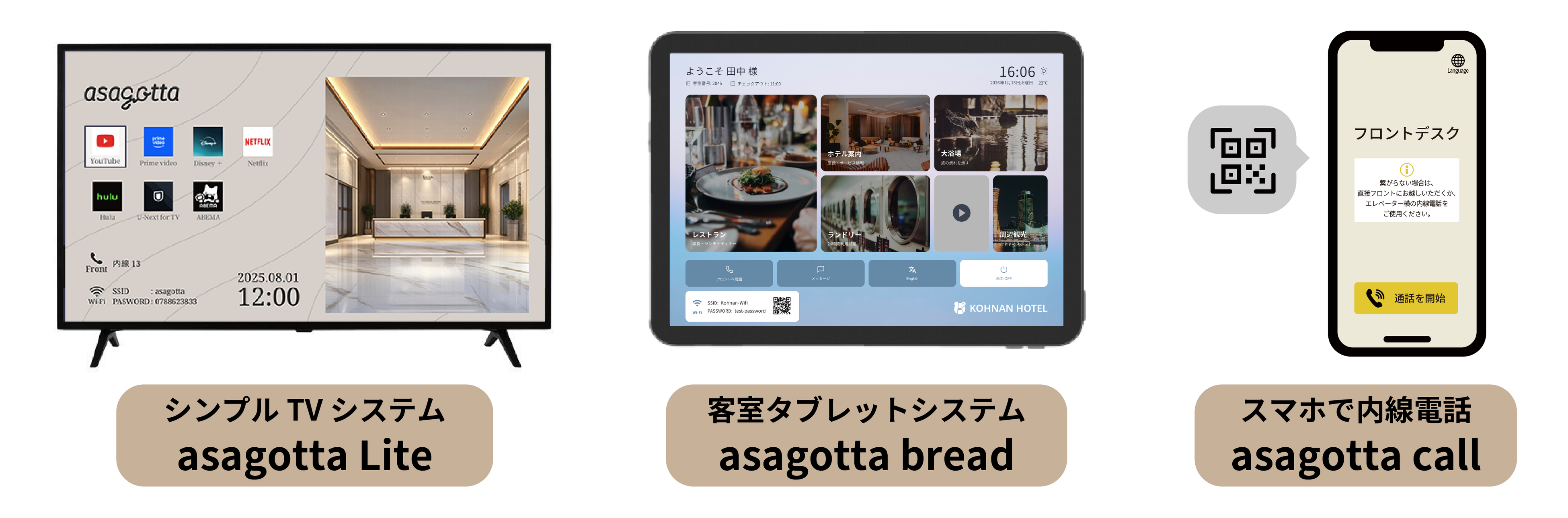 弊社ブースでは、主力商品である客室TVインフォメーションシステム「asagotta TV」を中心としたホテル向けシステムと、Wi-Fiや内線電話機などのインフラを含めた総合的なソリューションをご提案します。