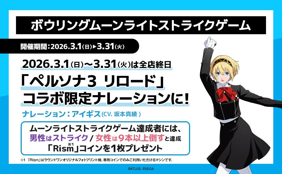 株式会社ラウンドワンジャパン(本社:⼤阪府⼤阪市、代表取締役社長:川口 英嗣)は、この度、2026年1月30日(金)から「ペルソナ3 リロード」×ROUND1 コラボキャンペーンを実施いたします。