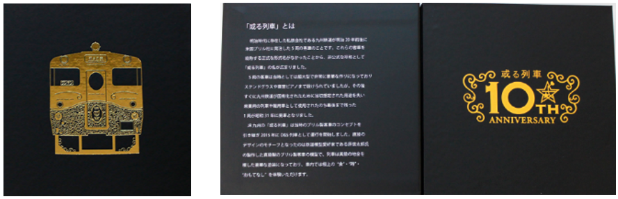 記念キーホルダーと、車両の銘板を表現したアクリルプレートを収容し、棚などに立てて飾ることができる専用ケースです。ケース表面には、「或る列車」の車両正面をデザインした金色の箔押し施した、高級感のある特別仕様に仕上げています。