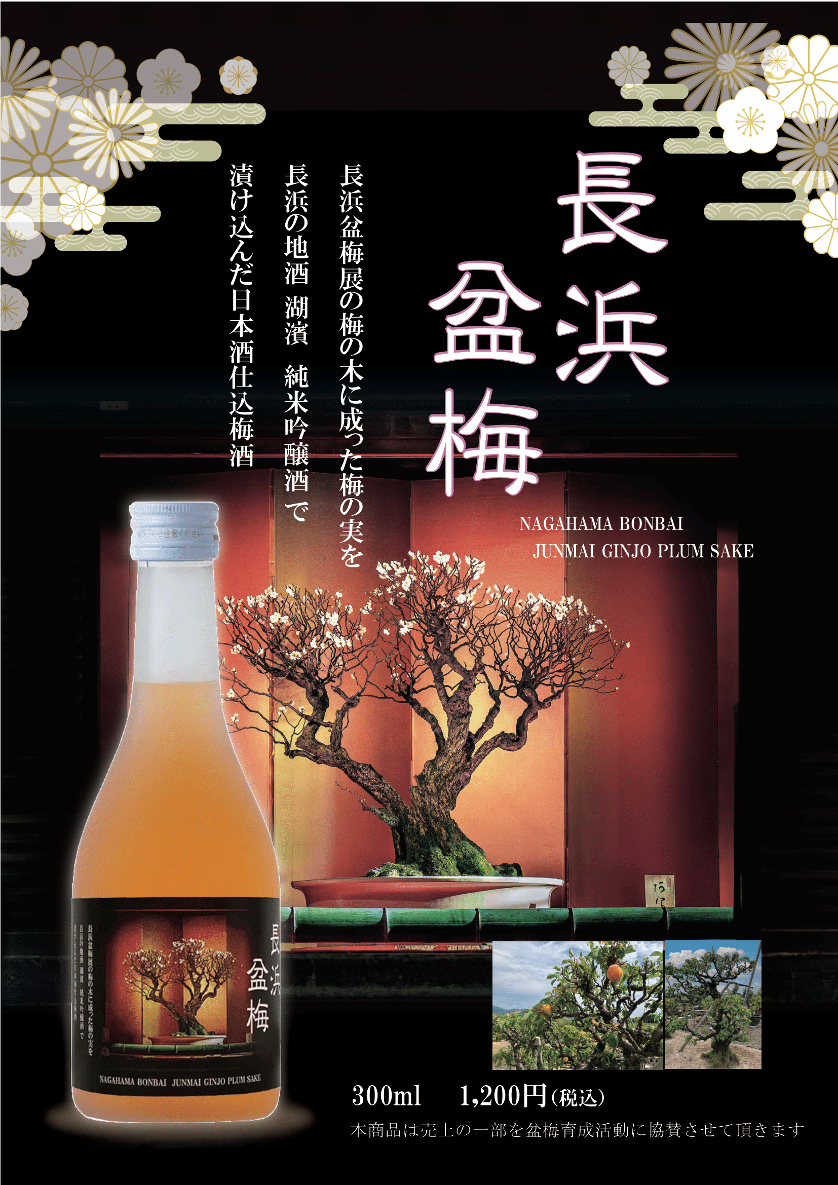 佐藤酒造株式会社(同市榎木町)との共同企画で、長浜盆梅展で管理している梅の実を使用した盆梅梅酒「長浜盆梅」が完成しました。慶雲館新館『梅の館』2階の売店で販売するほか、同フロアの「盆梅酒庵 旅人~tabito~」でも提供します。(数量限定)