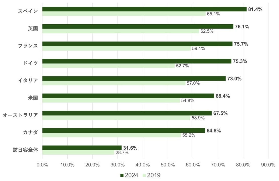 特に欧米豪市場での伸びは顕著で、2024年時点の実施率は、米国68.4%、カナダ64.8%、英国76.1%、ドイツ75.3%、フランス75.7%、イタリア73.0%、スペイン81.4%、オーストラリア67.5%と、多くの国で6~8割に達しています。また、コロナ前から10ポイント以上上昇している国も多く見られます(図表)。単なる観光名所巡りではなく、日本文化の背景を深く理解する体験への関心が高まっています。