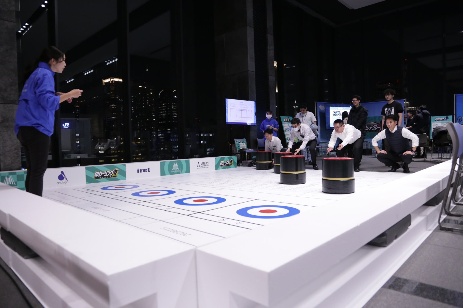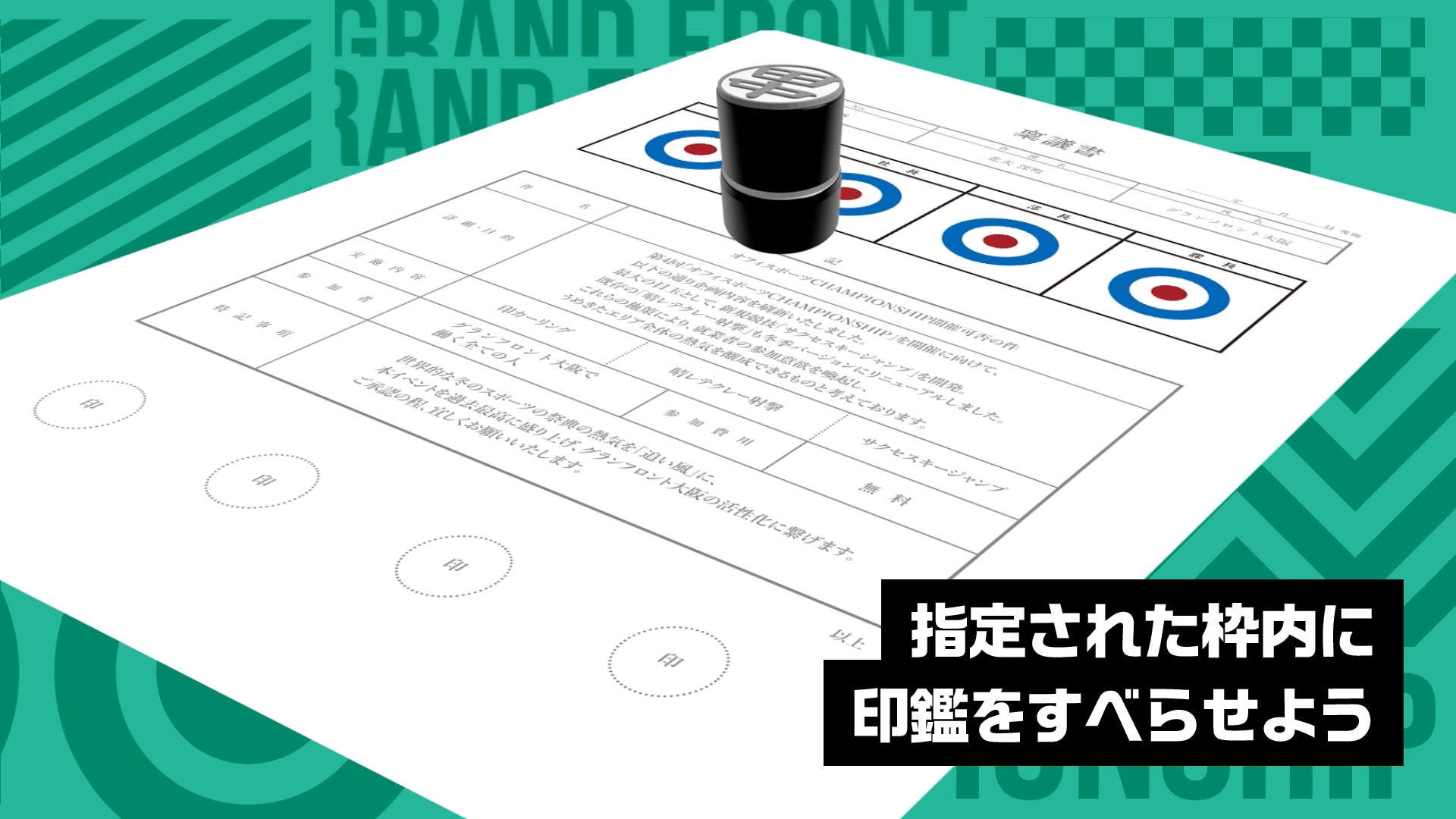 巨大な稟議書を舞台に、キャスター付きの印鑑型ストーンを滑らせて課長・部長・社長の承認欄を狙うカーリング競技。中心に近いほど高得点となり、慎重さと戦略性が問われます。日本の伝統的なビジネスの慣習である稟議文化をモチーフにしており、親しみのある就業者ならではの盛り上がりを見せる人気競技です。