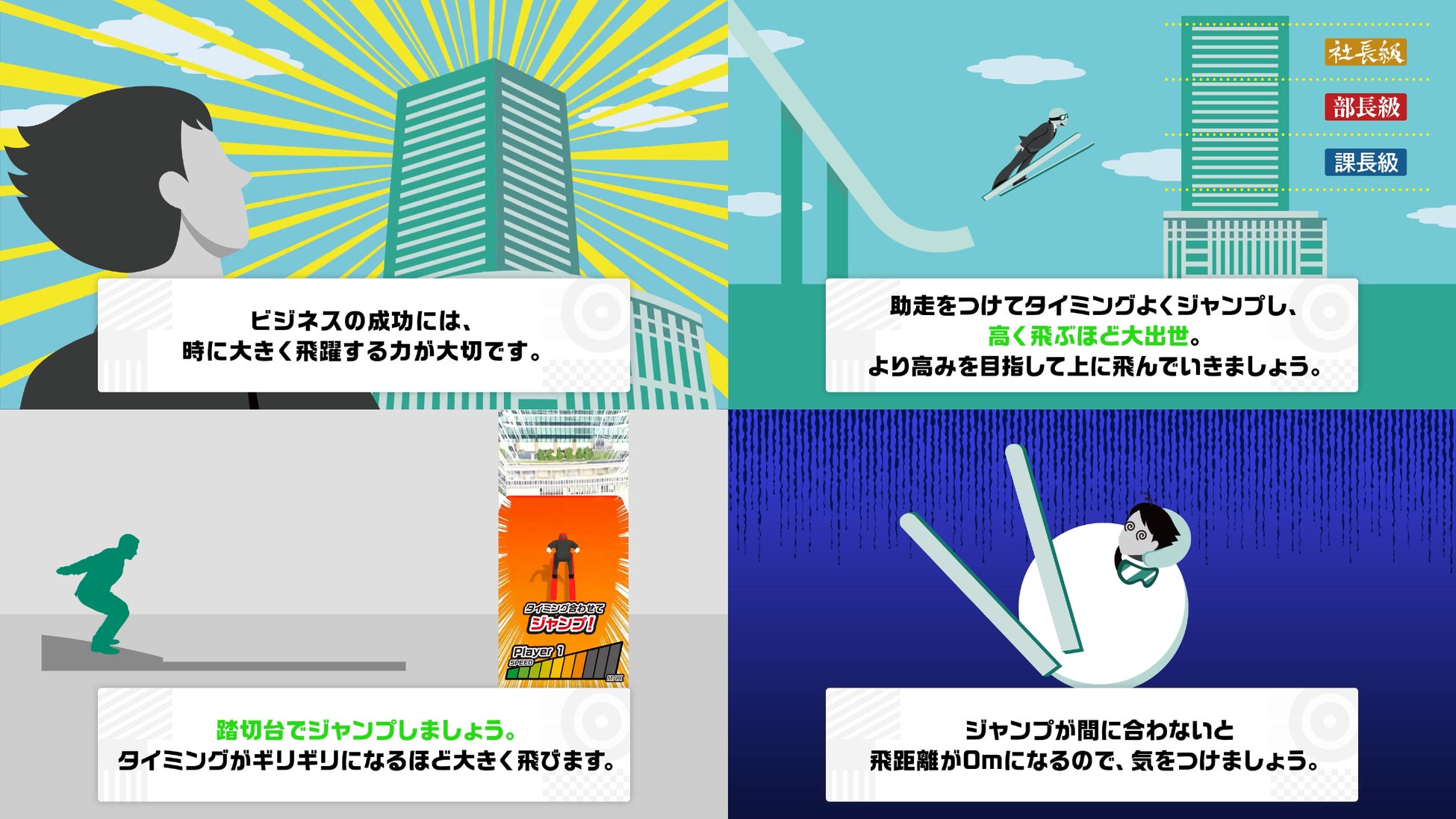 スキージャンプをモチーフに、踏切台からタイミングよくジャンプすれば高得点となる競技です。ビジネスで大きな成功を収めるには時に大きく飛躍する力が大切という例え話から着想を得ました。