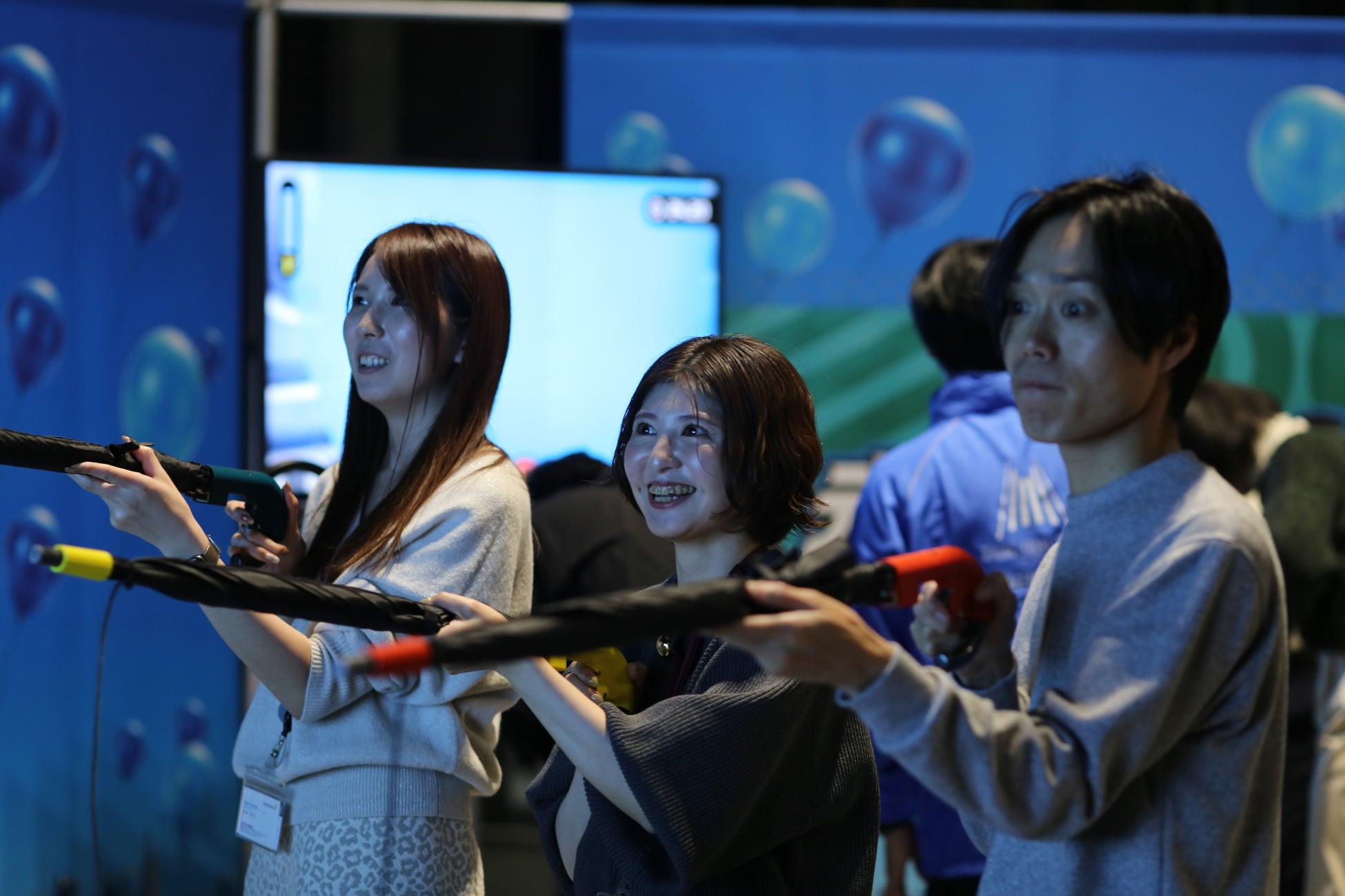 昨年も好評だった「晴レテクレー射撃」が、今年は冬季バージョンにアップデート。クレー射撃競技をモチーフに、画面に現れる雪雲や金色の雲、UFOを傘型のデバイスで狙う競技です。参加者となる店舗スタッフ等にとって、雪や雨ではなく、より集客・売上の見込める晴れの日を願う思いから着想を得ました。