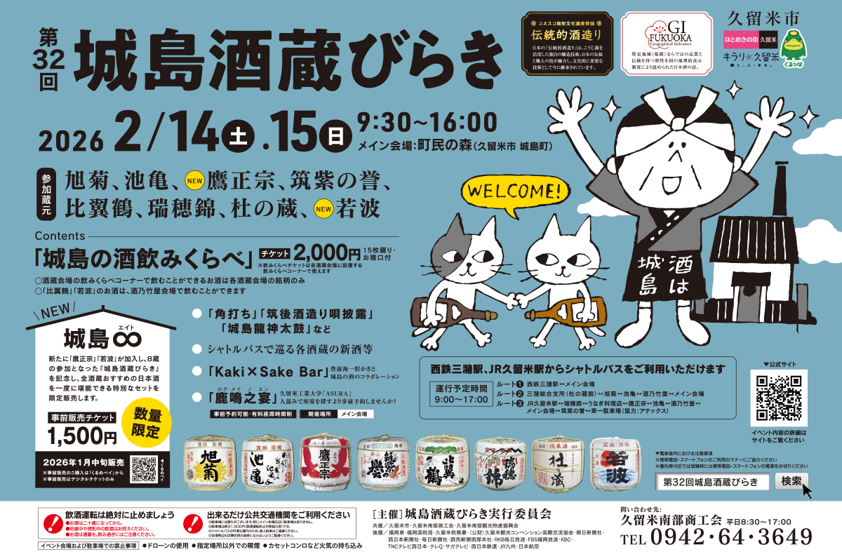 2月14日(土)・15日(日)、久留米市城島町にて「第32回 城島酒蔵びらき」が今年も開催されます。