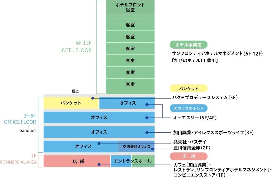 この言葉には、豊川駅前の好立地に誕生する「地域の顔となる」「時代の先端を行く」「人とビジネスが出会う前線となる」という想いが込められています。 FRONTIS TOYOKAWAは、豊川駅前に誕生する“ビジネスと交流の最前線”オフィス、ホテル、商業、地域交流の各機能が融合し、豊川市の新たなランドマークとして、地域の観光・商業の活性化を目指します。