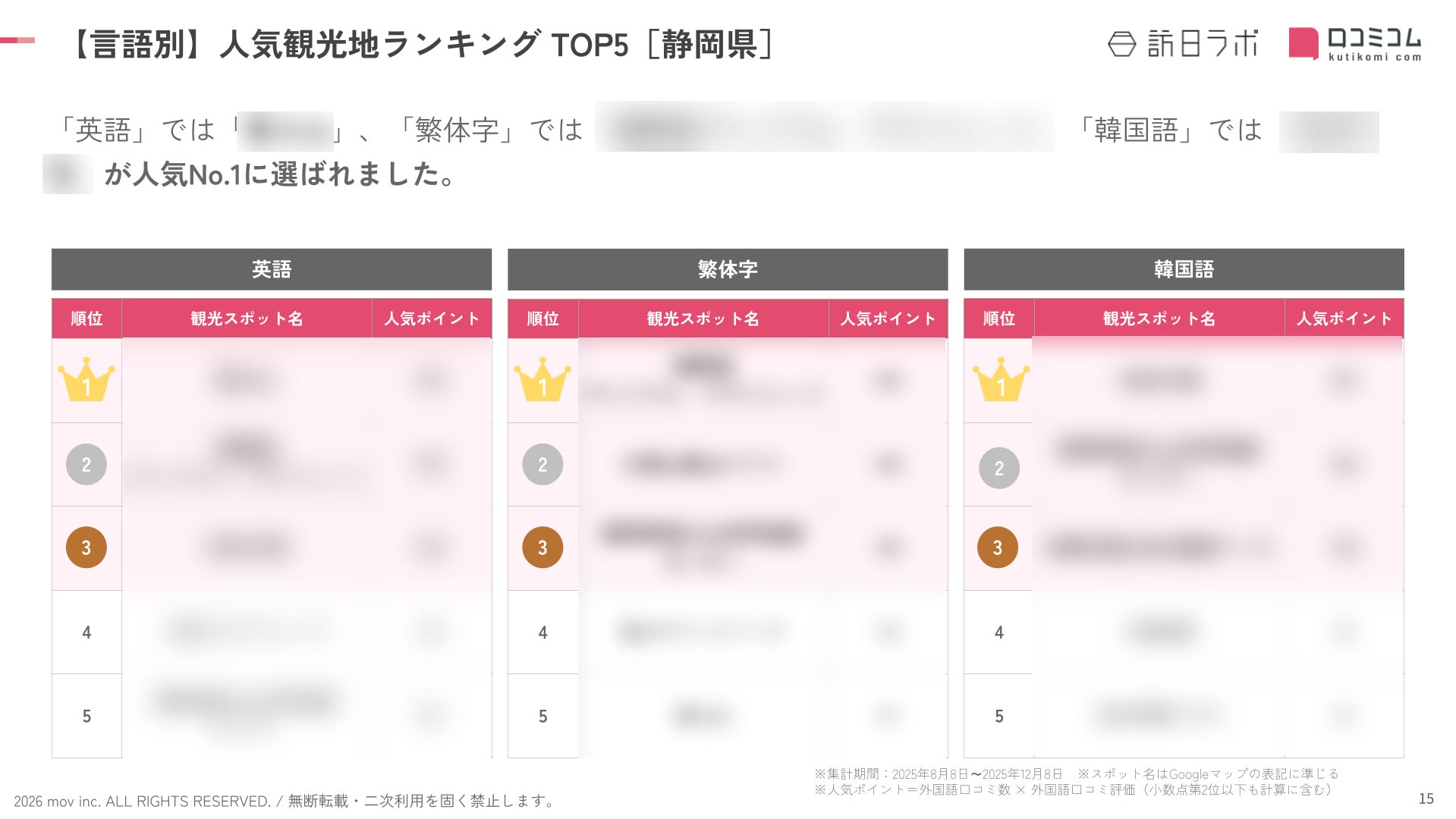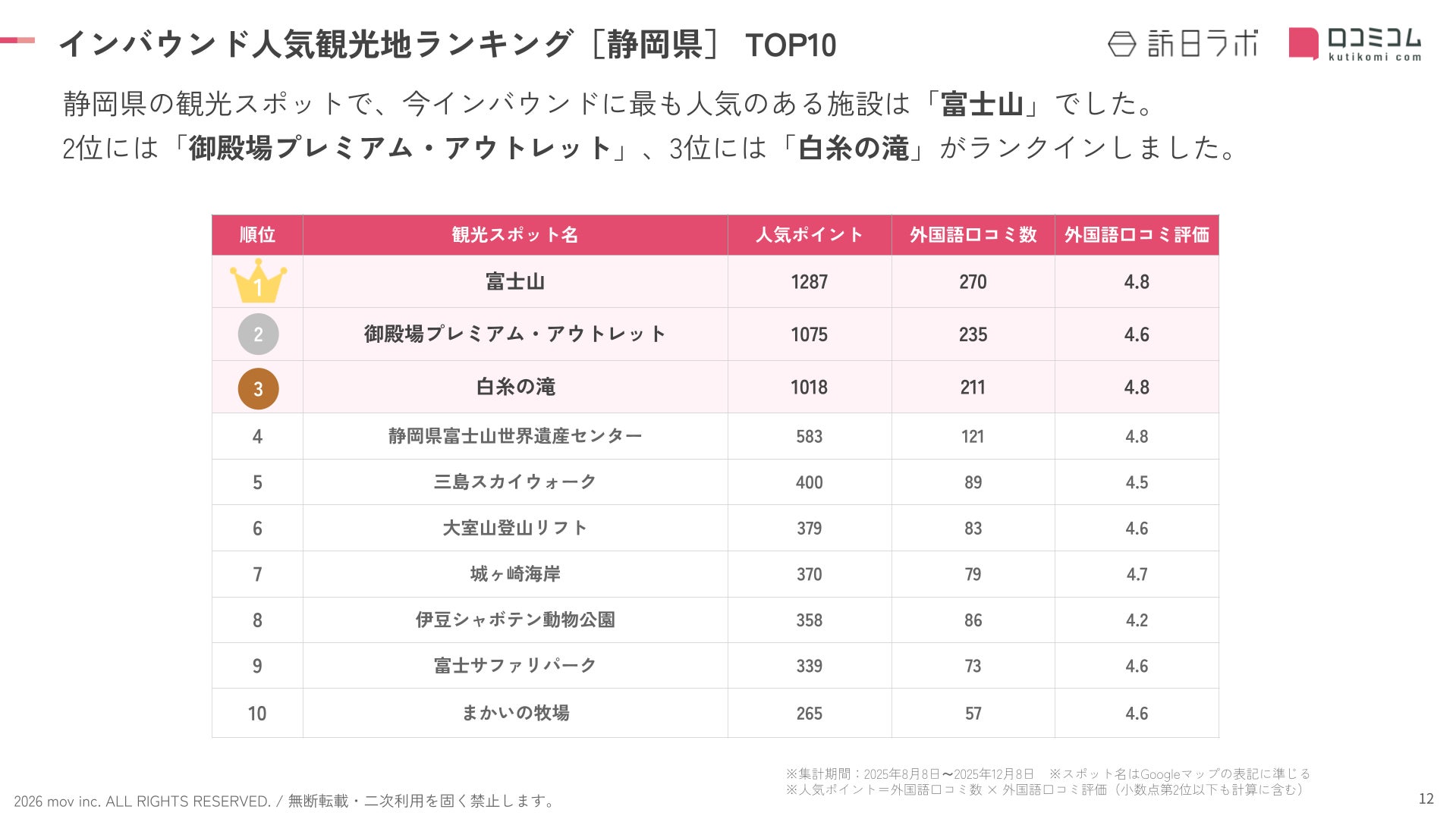 業界最大級のインバウンドビジネスメディア「訪日ラボ」及び 店舗向け集客一元化プラットフォーム「口コミコム」を運営する株式会社mov(代表取締役:渡邊 誠、本社:東京都渋谷区、以下mov)は、静岡県の観光地に寄せられた最新の口コミデータから、独自の『インバウンド人気観光地ランキング』を発表しました。