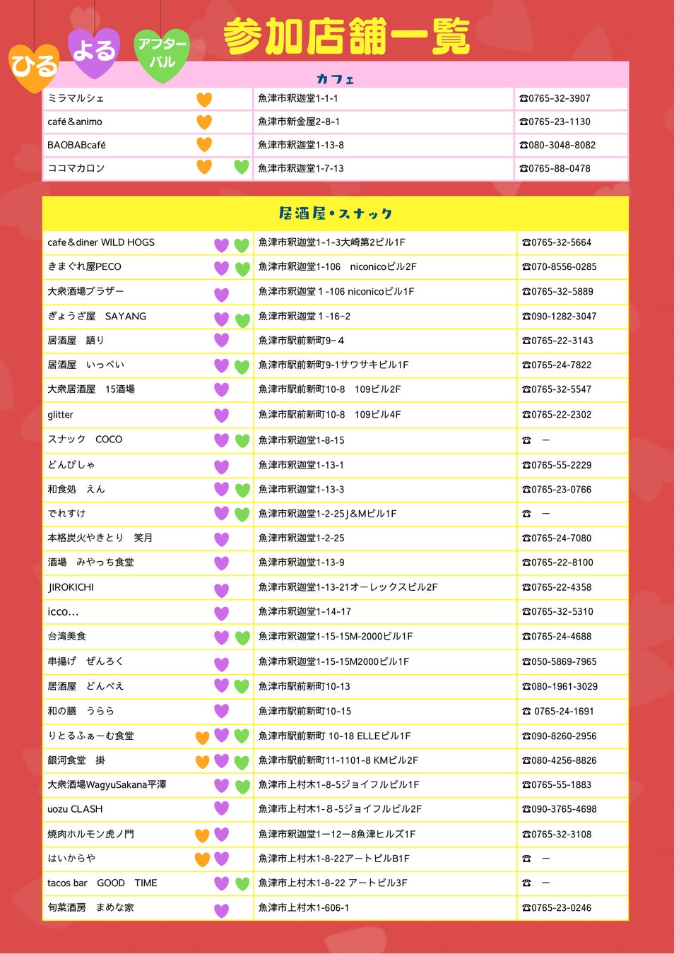 イベント当日は、飲食に限らずチケット1枚1,100円相当としてタクシー(魚津交通、金閣タクシーが対象)にも利用できます。また、当日中にチケットを使いきれなかった場合は、「アフターバル期間:2月15日(日)~2月21日(土)」において対象店舗でチケット1枚を1,100円分の金券として利用できます。