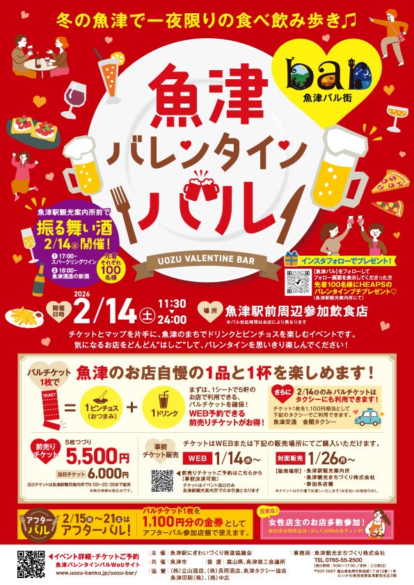 魚津駅にぎわいづくり推進協議会(会長 四十万隆一/事務局 魚津観光まちづくり株式会社)は、2月14日(土)に「はしご酒」を楽しむグルメイベント「魚津バレンタインバル」を初開催します。5枚つづりのバルチケットを使って最大5軒の食べ飲み歩きが楽しめるイベントです。チケット1枚につき対象店舗で1ドリンクと1ピンチョス(おつまみ等)が提供されます。当日は富山県東部最大級の飲食店街・柿の木割りの飲食店など約30事業者(2026年1月時点)が参加予定。女性店主の店舗も多く、女性の活躍を応援する機会にもつなげます。