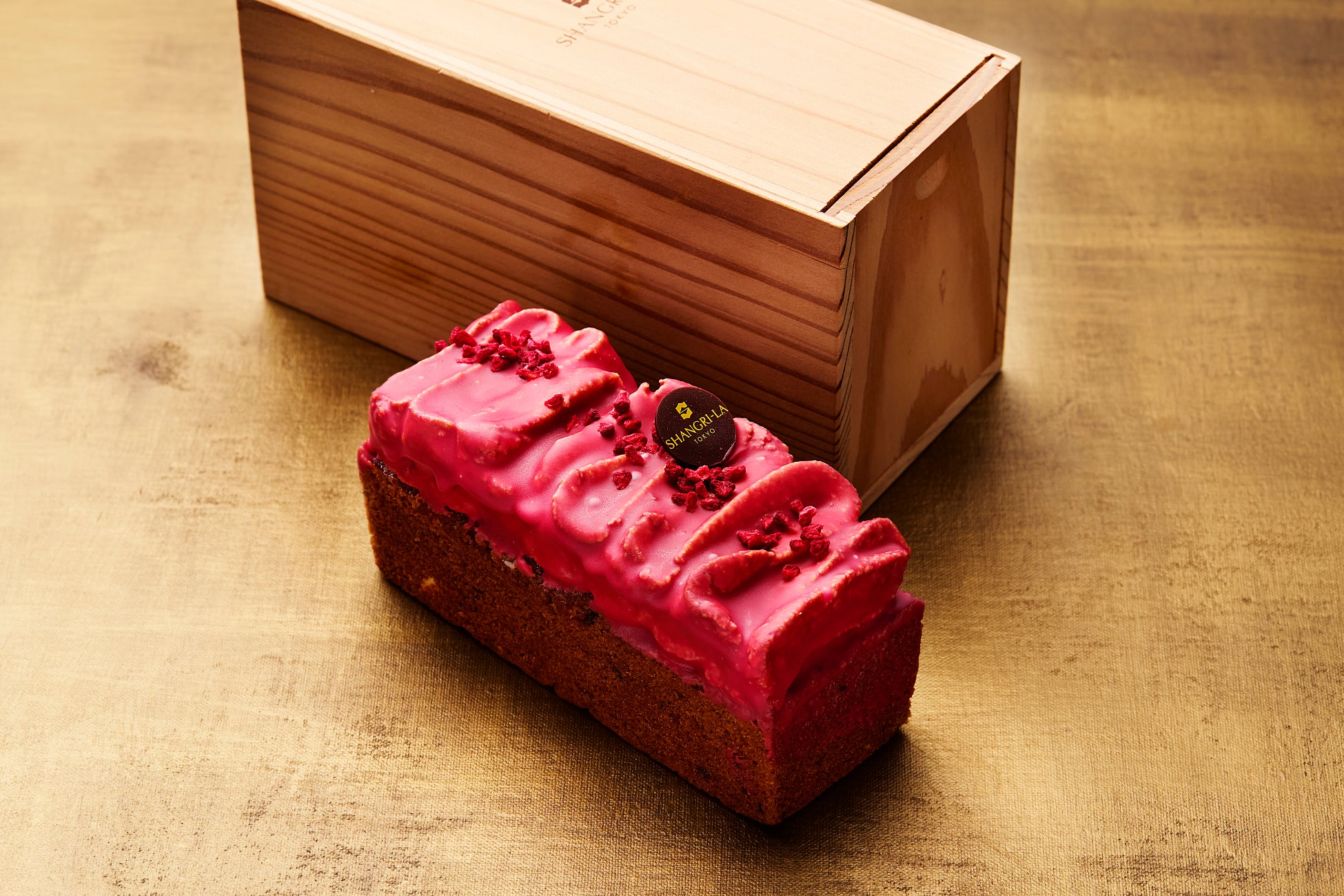 二つのレイヤーで、それぞれ異なる食感と酸味のアクセントが楽しめるパウンドケーキ。下の層はホワイトチョコチップとラズベリーのパウンドケーキ、上の層はラズベリーチョコレートでコーティングしたダックワーズに、ドライラズベリー、ロゴ入りチョコをあしらいました。