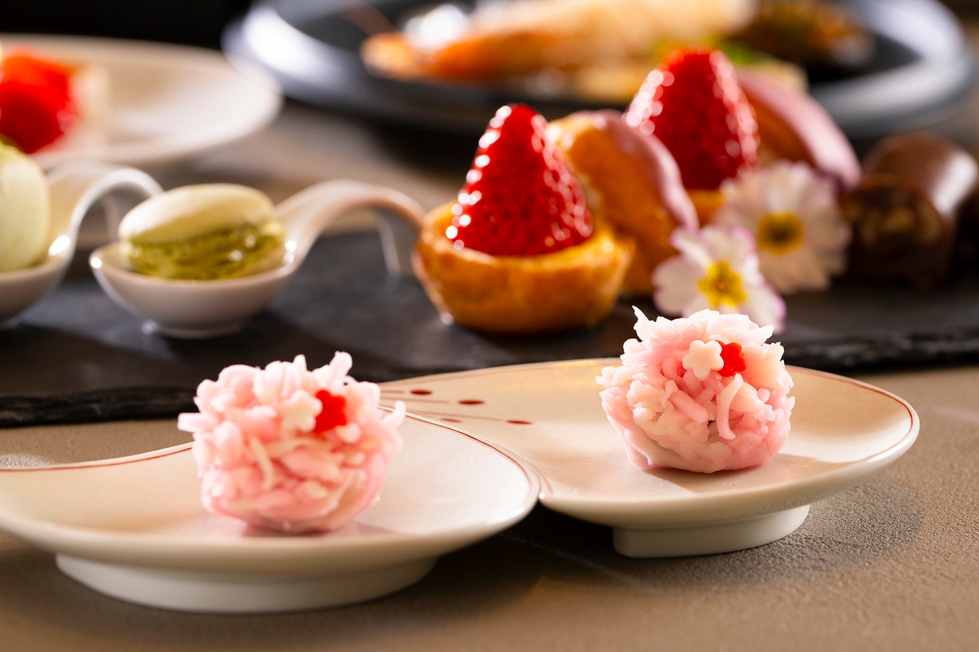 松江市では松平治郷公(不昧公)の命日である4月24日を「茶の湯の日」と定め、毎月24日を茶の湯文化に親しんでもらう日としており、当ホテルでは24日に合わせてアフタヌーンティーと茶の湯文化を合わせた企画を展開しています。今回は、安来産のブランド苺“紅ほっぺ”や、冬から春へと移ろう旬の素材をふんだんに使用。大切な方と心穏やかな時間を過ごしていただけるよう、1日4組(最大8名様)限定のゆとりあるお席をご用意いたしました。伝統的な和の技法とモダンな洋の感性が織りなす、この期間だけの特別な内容でお届けいたします。