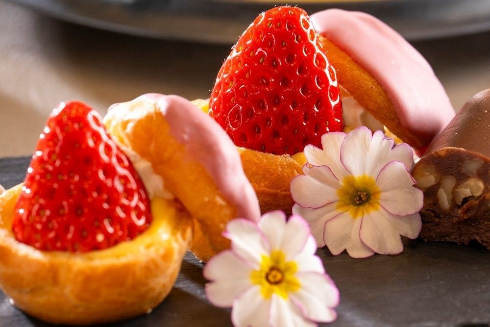 スイーツの主役は、安来産のブランド苺“紅ほっぺ”を贅沢に飾った「ルビーショコラのシュークリーム」。濃厚な甘みの紅ほっぺと、フルーティーなショコラの華やかな出逢いをお楽しみいただけます。その他にも、瑞々しい苺を使った「ブラマンジェ」や「ブリュレ」、さらに清々しい香りのデコポンを閉じ込めた「寒天寄せ」など、早春の果実がテーブルを彩ります。