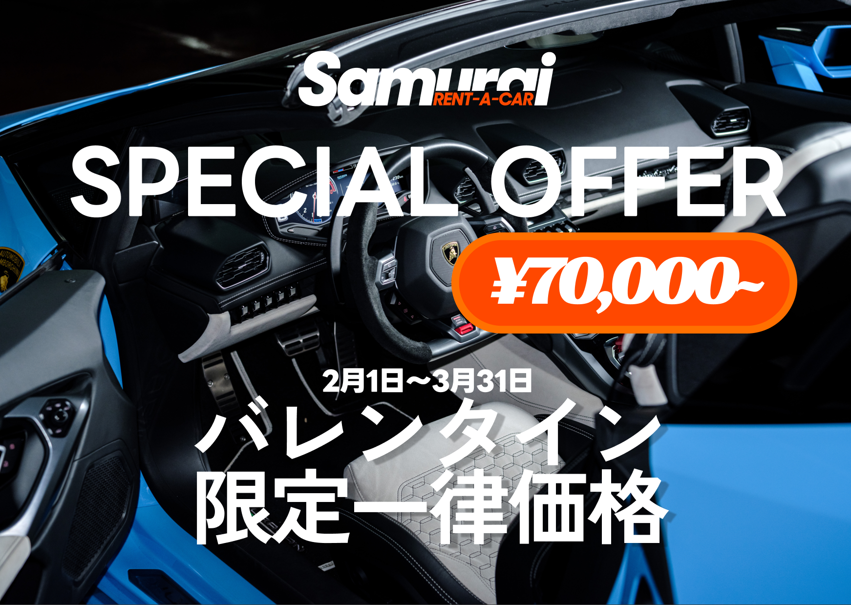 超高級車に特化したレンタカーサービスを展開する株式会社SAMURAI(本社:神奈川県横浜市都筑区)は、2026年2月1日(日)より「バレンタイン&ホワイトデー特別キャンペーン」を実施いたします。大切な人との特別な時間を演出するため、ロールスロイス、ランボルギーニ、マクラーレン、アストンマーティンの人気4車種を期間限定で一律7万円の特別価格でご提供いたします。