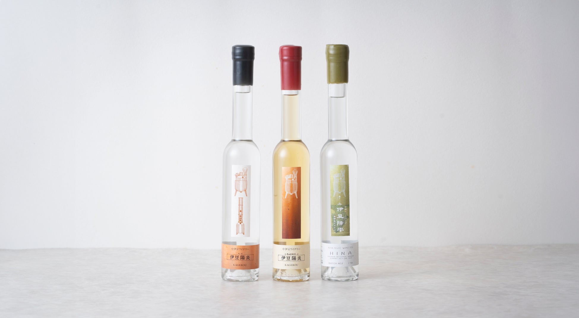 中伊豆ワイナリーでは、これまでワインを造り終えたぶどうの搾りかすを蒸留して造る、イタリアのブランデー「グラッパ」にならった製法で、2種類の蒸留酒を製造してきました。創設者がグラッパと出会い、イタリアにて設計・発注し中伊豆へ導入した、日本最小クラスのグラッパ蒸留機(連続式)で造られたブランデー。その名は、『伊豆陽炎』(左)と『伊豆陽炎BARREL』(中央)。