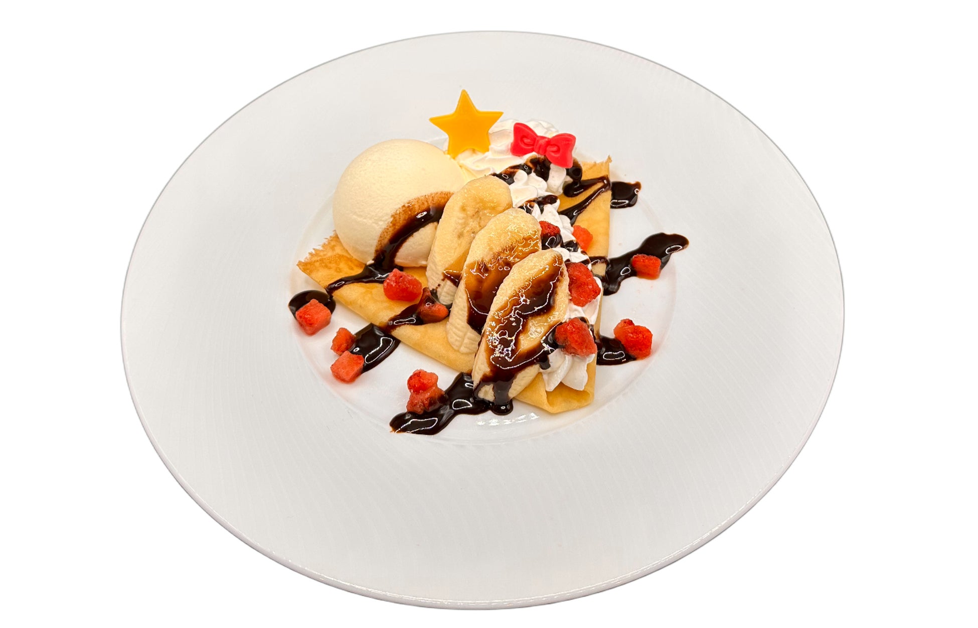 イチゴチョコバナナアイスクレープに、「弐乃ちゃんのリボン」と「ミヲちゃんの星の髪飾り」のチョコレートを乗せました。
