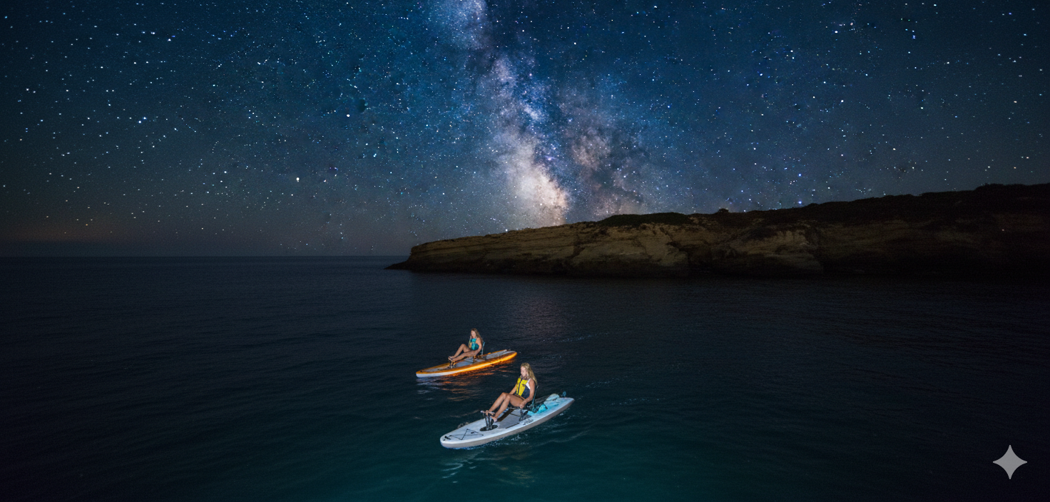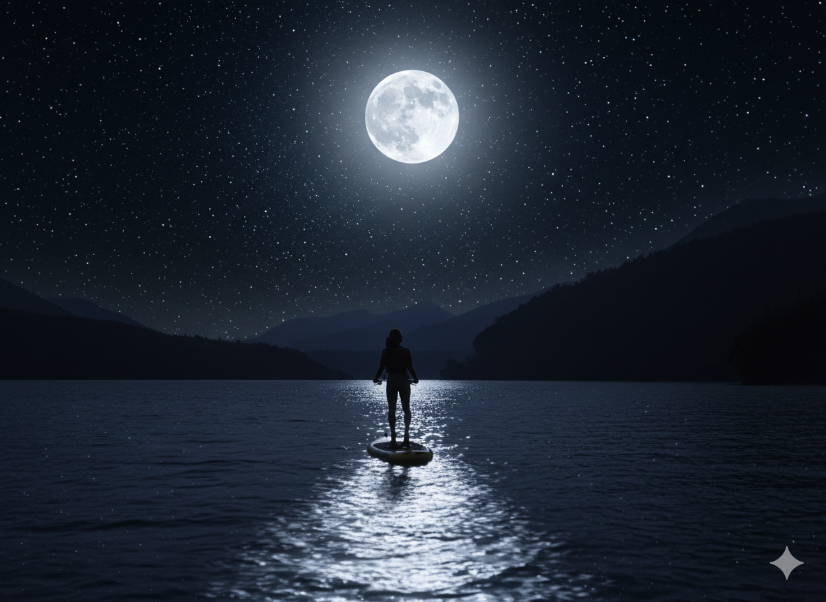満月のエネルギーが最大になる夜、海面に現れる幻想的な「月の道」をHOBIEで進みます。パドルを使わない足漕ぎのため、水音が最小限に抑えられ、没入感が高まります。両手が自由になるため、水上で月を眺めながらの瞑想も可能です。